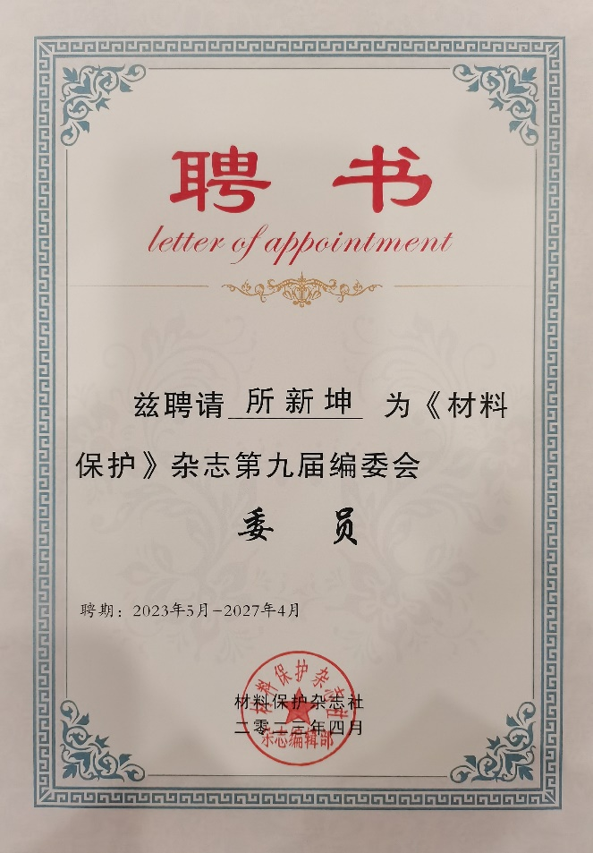 2023年4月,《材料保护》杂志社在武汉召开第九届编委会委员工作会议,选举产生了第九届杂志编委会成员,成人动漫 所新坤教授入选《材料保护》杂志第九届编委会委员。