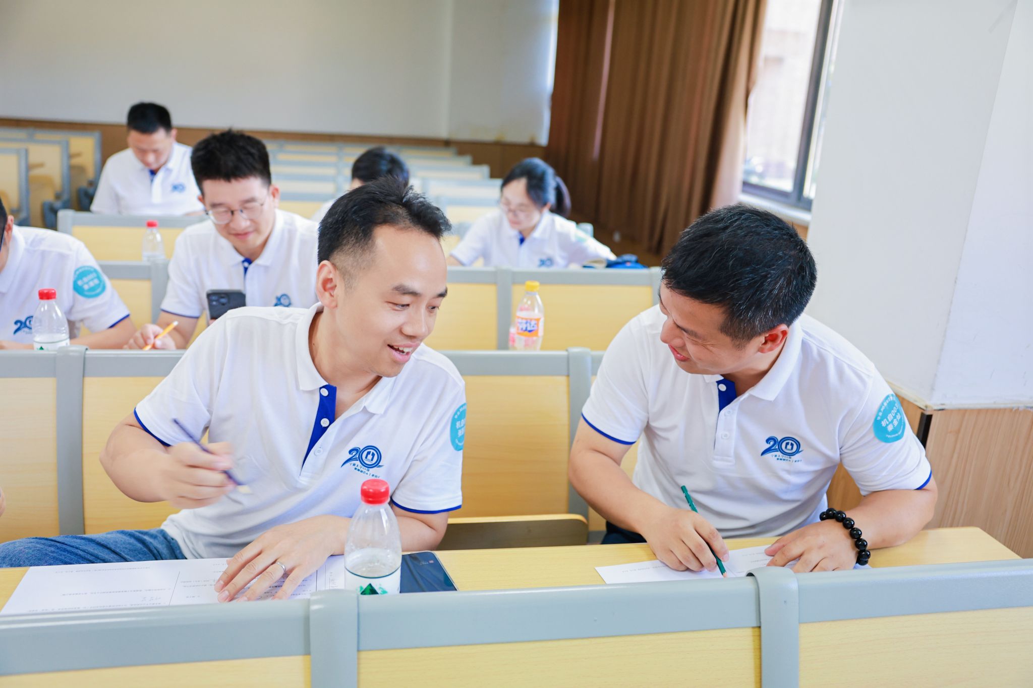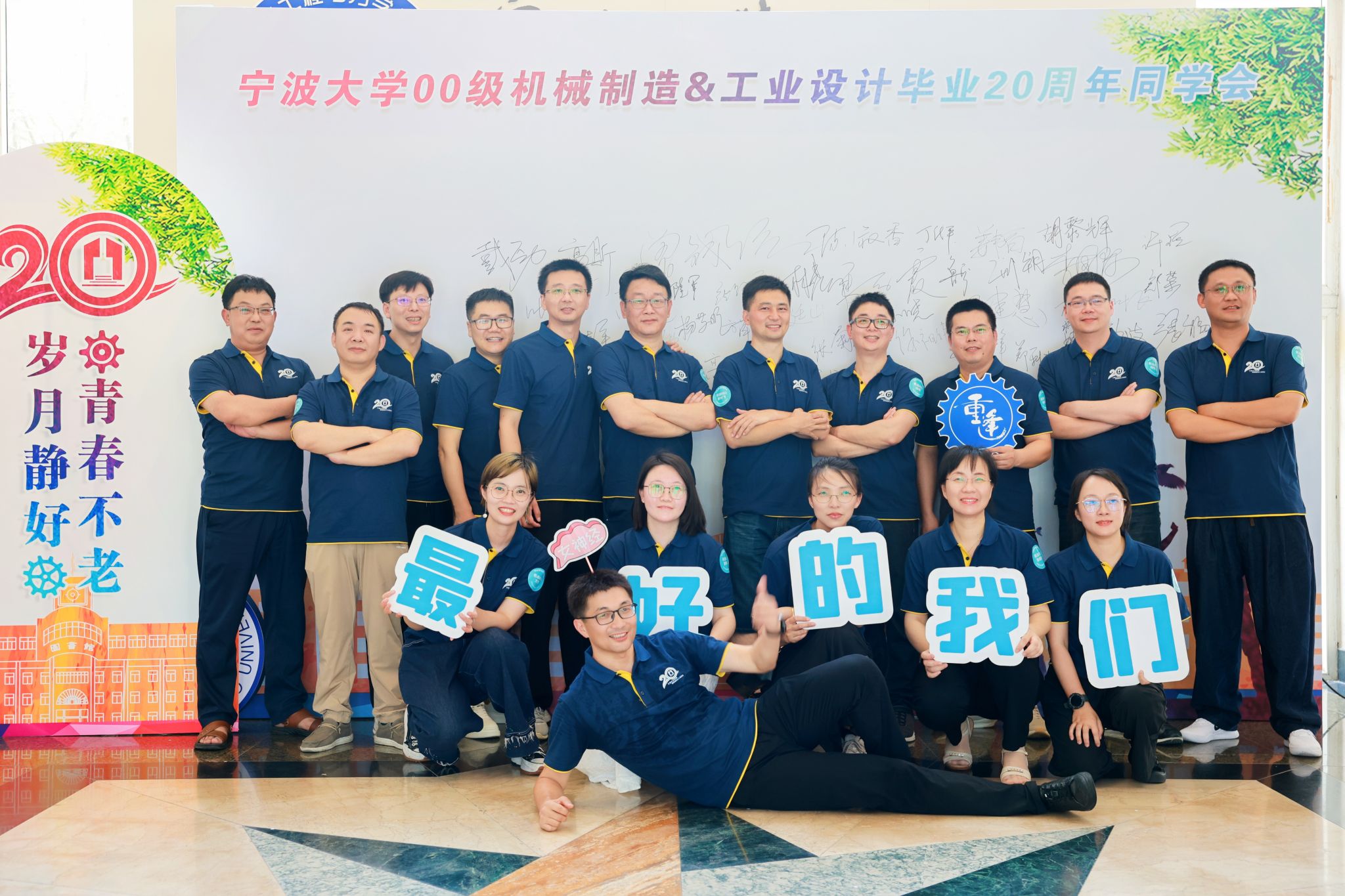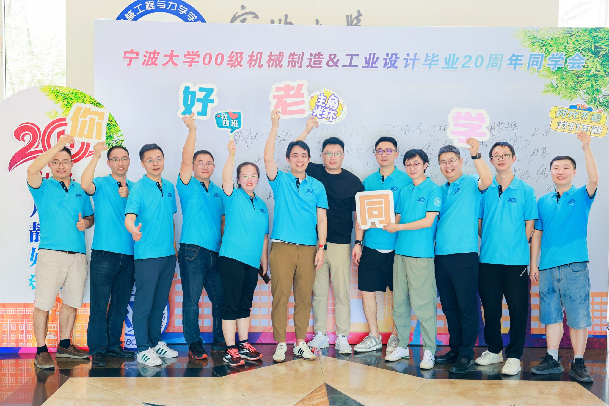 阳光炽热,正如他们心中那份不灭的热情。活动现场,一面特设的签到墙成为了焦点,校友们纷纷上前,用马克笔留下自己的名字,一笔一划间,仿佛也在描绘着各自这二十年的成长轨迹。随后,每位校友都换上了统一的文化衫,大家簇拥在一起,拍摄下一张张跨越时空的珍贵合照,定格了重逢的喜悦与激动。