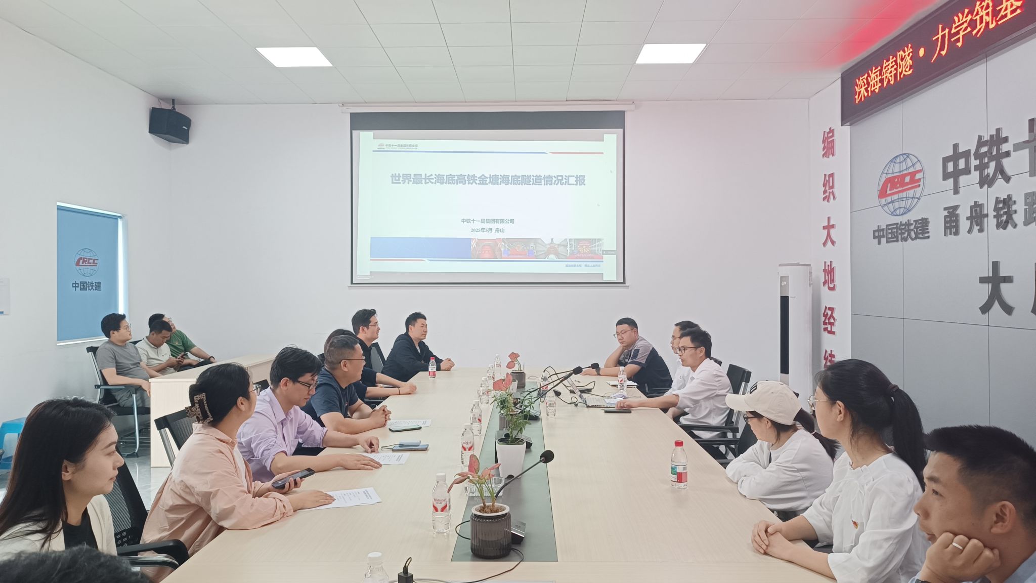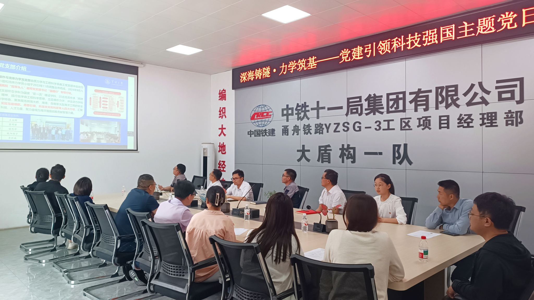 中铁十一局集团甬舟铁路工区项目部党支部副书记周俊对爆炸与流体力学教师党支部、行政教工党支部一行的到来表示热烈欢迎,详细介绍了甬舟铁路项目的整体规划、建设进展及技术难点。他强调,甬舟铁路作为国家“十四五”重点工程,甬舟海底隧道是世界建设长度最长、直径最大的海底高铁隧道,是甬舟铁路控制性工程,高铁海底隧道段面临复杂地质条件、高水压环境等挑战,亟需高校科研力量的支持,尤其在精准施工控制、岩土力学、沉管上浮流体力学优化及安全监测等方面提供技术支撑。