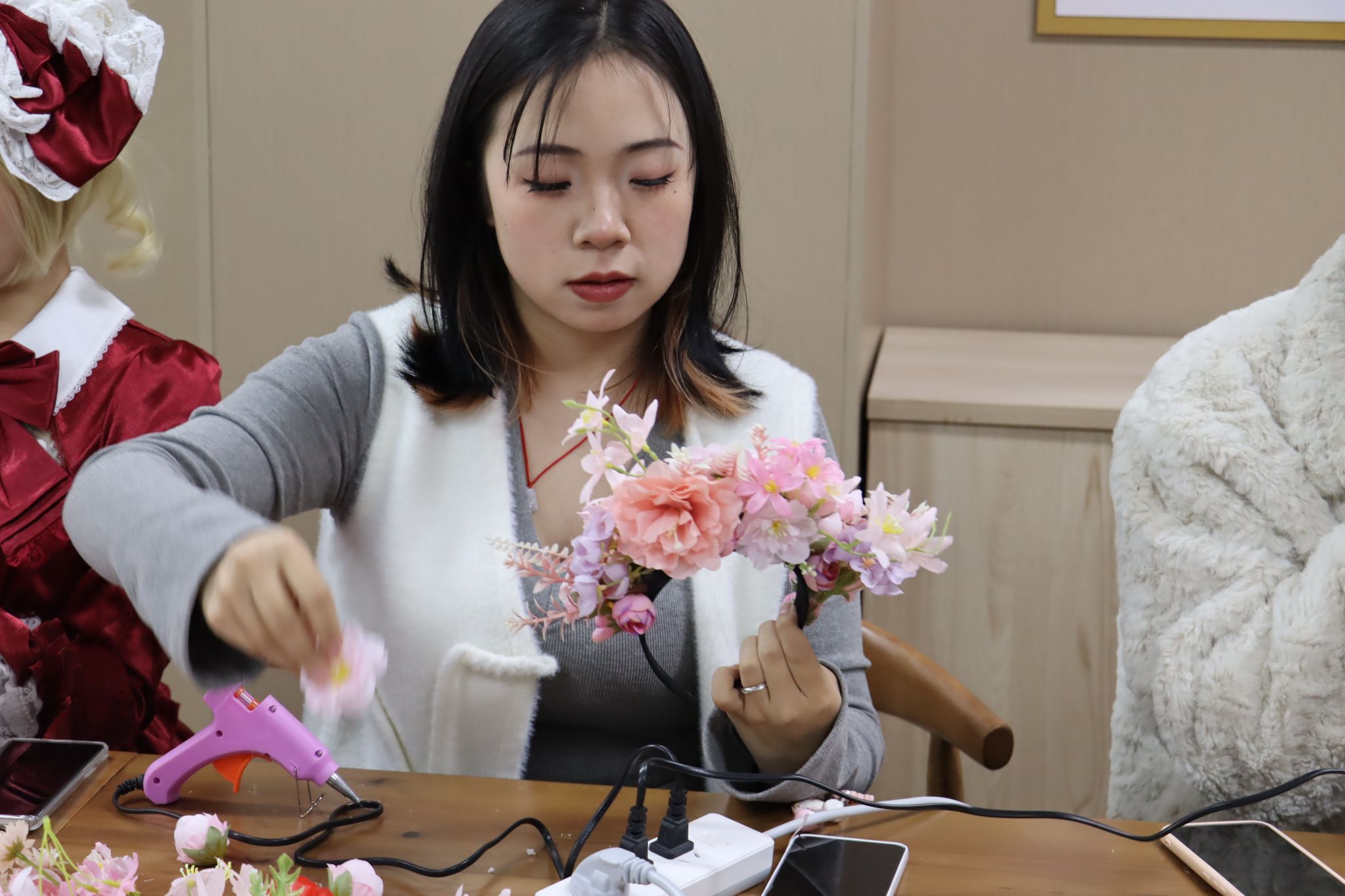 学院为同学们准备了花卉、发箍、热熔胶等材料,在讲解簪花制作步骤并展示精美成品后,同学们兴致勃勃地开始了创作。他们充分发挥想象力,将不同颜色、形状的花朵进行巧妙搭配,做出一件件独特的簪花作品,大家都表示没想到第一次尝试也能做出这么漂亮的作品。本次活动通过传统簪花艺术,展现女性美好与智慧,致敬每一位在各自岗位上奋斗的女性,不仅让同学们体验到手工制作的乐趣,陶冶了情操,放松了身心,更增强了学院的凝聚力和向心力。