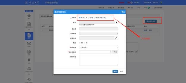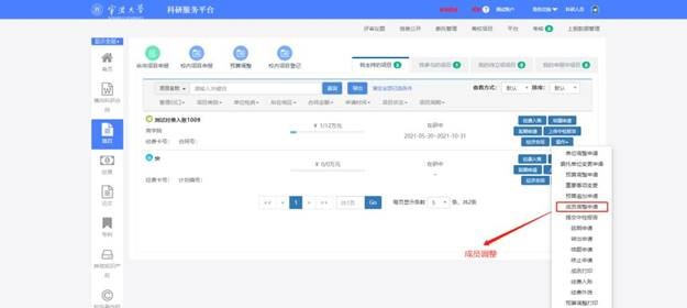4. 进入项目组成员,请确认成员是否完整。特别是项目中有学生的参与的,请完善学生身份类别。成员信息有问题的,进入科研系统成人动漫,左侧的项目界面,点击操作下拉框下的成员调整申请,进入成员调整界面进行添加和修改,待项目主管审核之后,会自动补充到项目经费公开一览表,最后再提交即可。