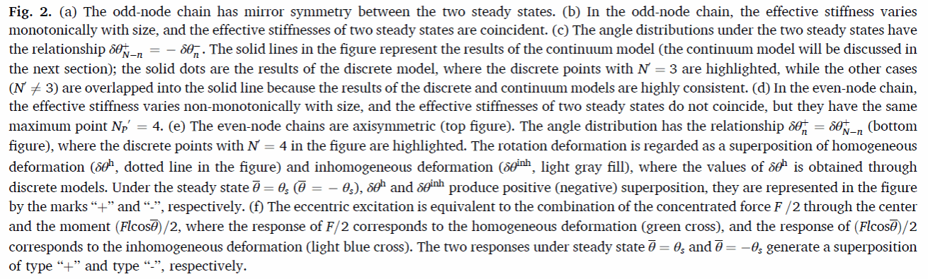 本工作通过理论和实验手段,系统的研究了双稳态柔性力学超材料链中的反常尺寸效应(刚度随尺寸的增加先增后减)。本工作在双稳态链的两种稳态下,特别是在任何初始配置和任何参数柔性铰链下,观察到了具有恒常临界性和振荡临界性的反常尺寸效应。这两种临界性恰好划分了刚度变化的递增和递减区间,恒常临界性对应着由竞争机制实现的反常尺寸效应,而振荡临界性则对应一种由新机制(相消机制)实现的反常尺寸效应。在由相消机制实现的反常尺寸效应中,由完全相消的变形产生的奇异特性使其具有极强的鲁棒性。这种鲁棒性体现在:该反常效应不再局限于线性小变形,即使在非线性大变形下,仍然能稳定地被观察到。本工作在定量层面阐释了柔性力学超材料的反常尺寸效应,提出的相消机制也明显拓展了该反常效应的应用范围,所提出的两种临界性为双稳态柔性力学超材料反常尺寸效应设计提供了关键定量依据。