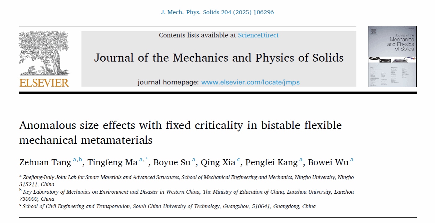 马廷锋教授课题组在固体力学旗舰期刊《Journal of the Mechanics and Physics of Solids》上发表学术论文“Anomalous size effects with fixed criticality in bistable flexible mechanical metamaterials” (J. Mech. Phys. Solids. 106296 (2025) ),通过理论和实验手段系统地研究了双稳态力学超材料中的反常尺寸效应,在定量层面上揭示了该反常效应。