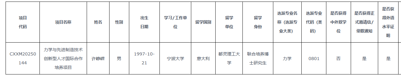 组织开展了对已获批创新型人才国际合作培养项目的人员申请工作。按照“公平、公正、公开”的原则,经个人申请、学院推荐许峥嵘申请2025年创新型人才国际合作培养项目,公示如下: