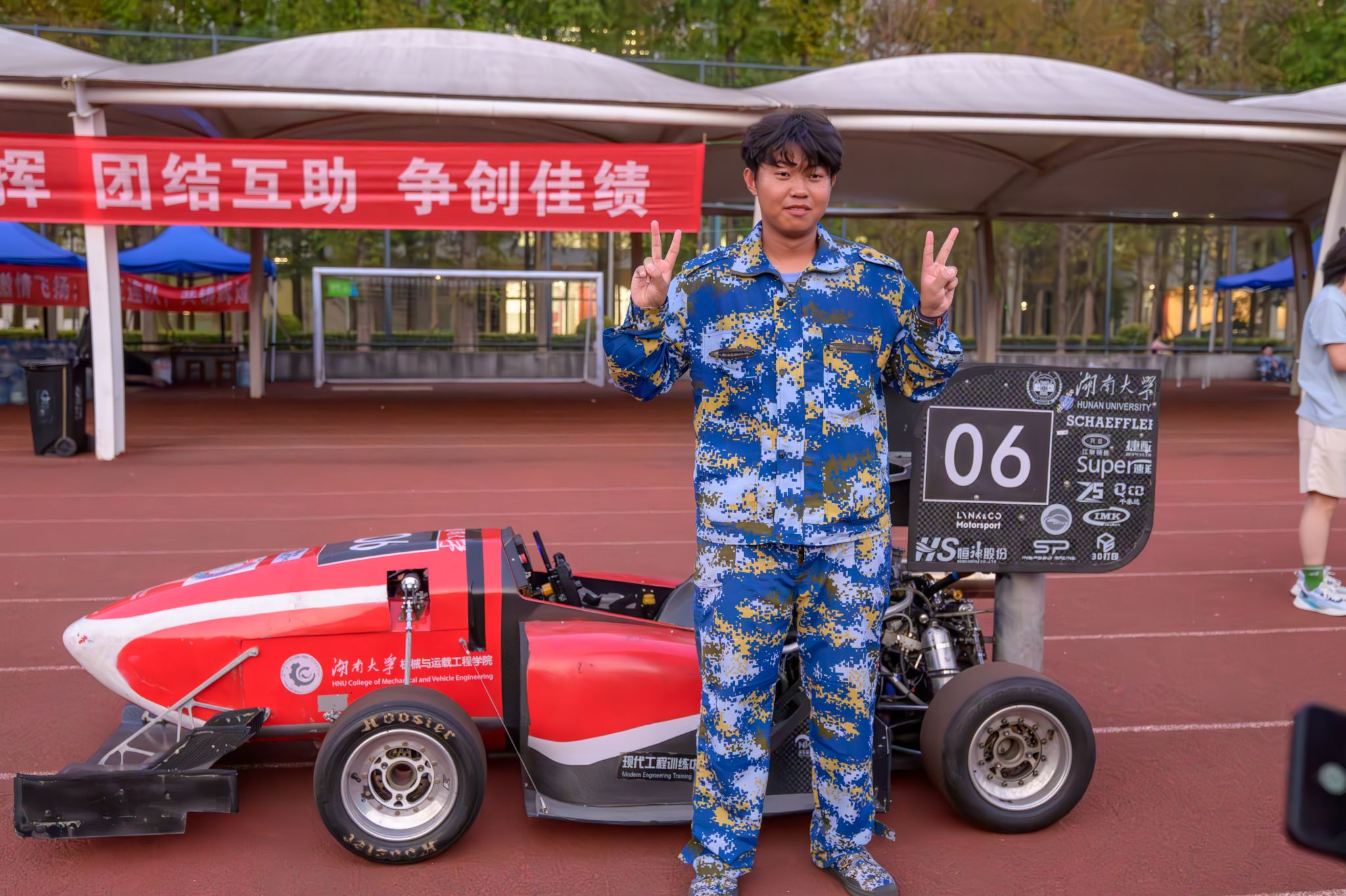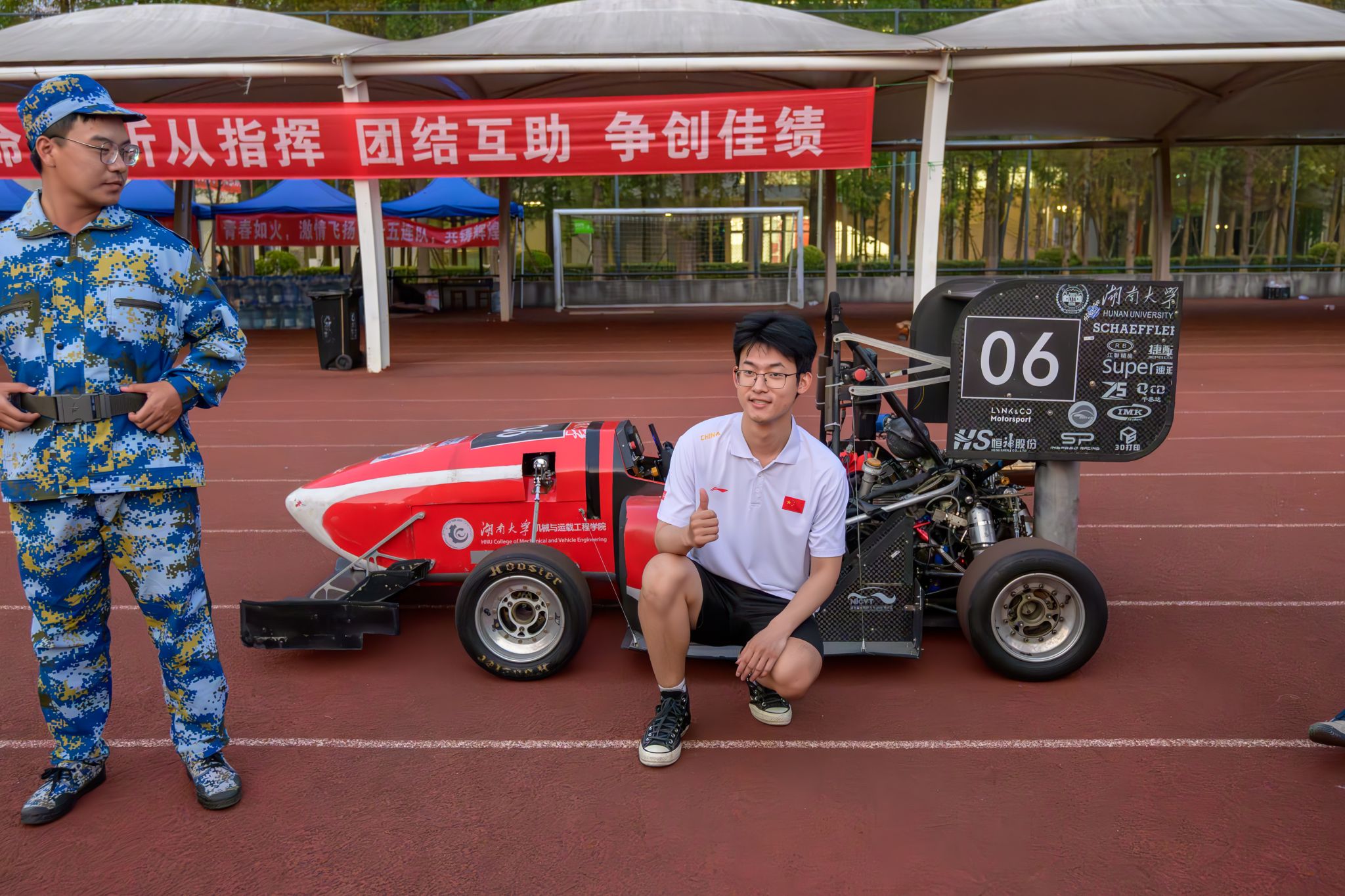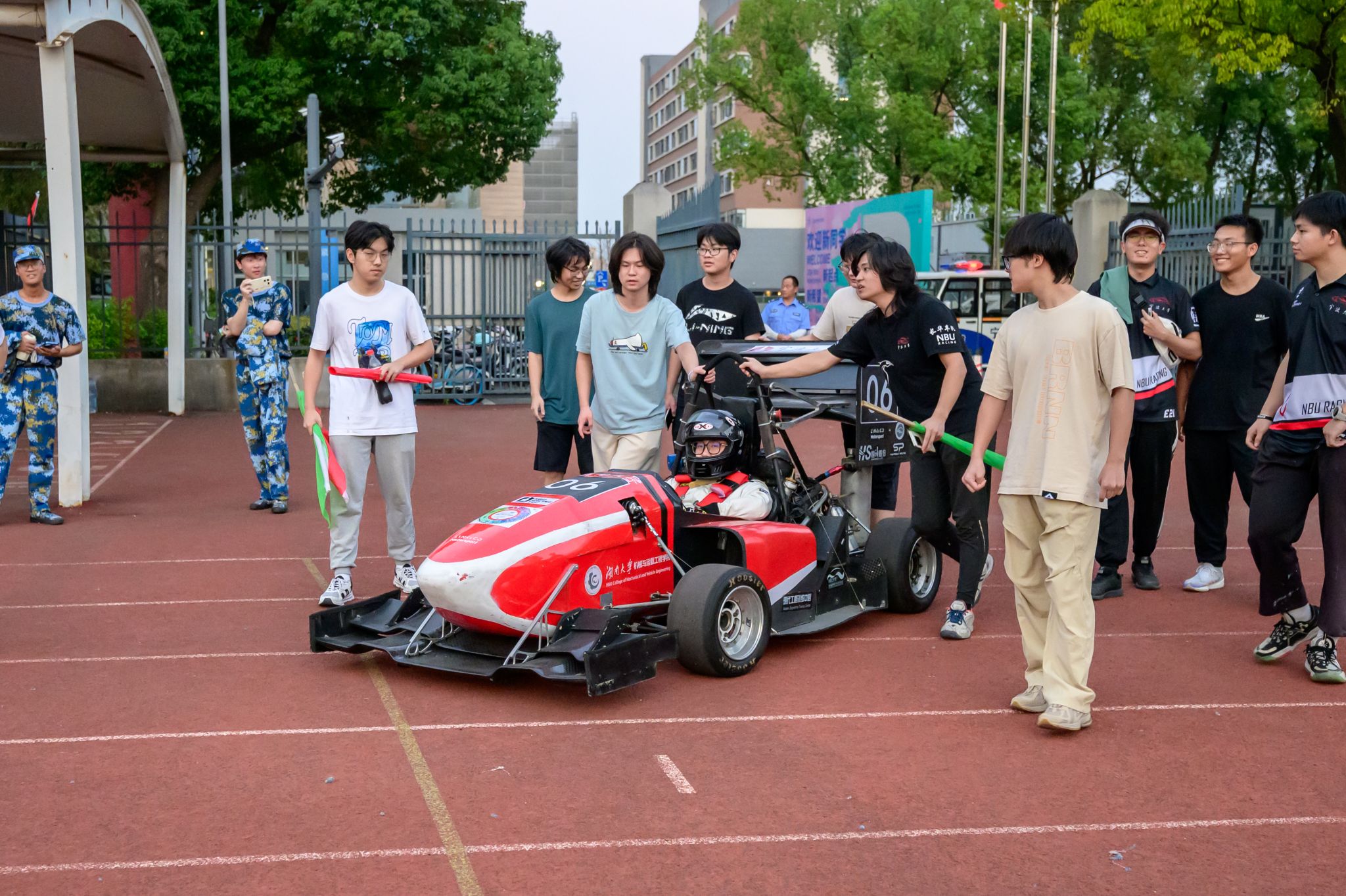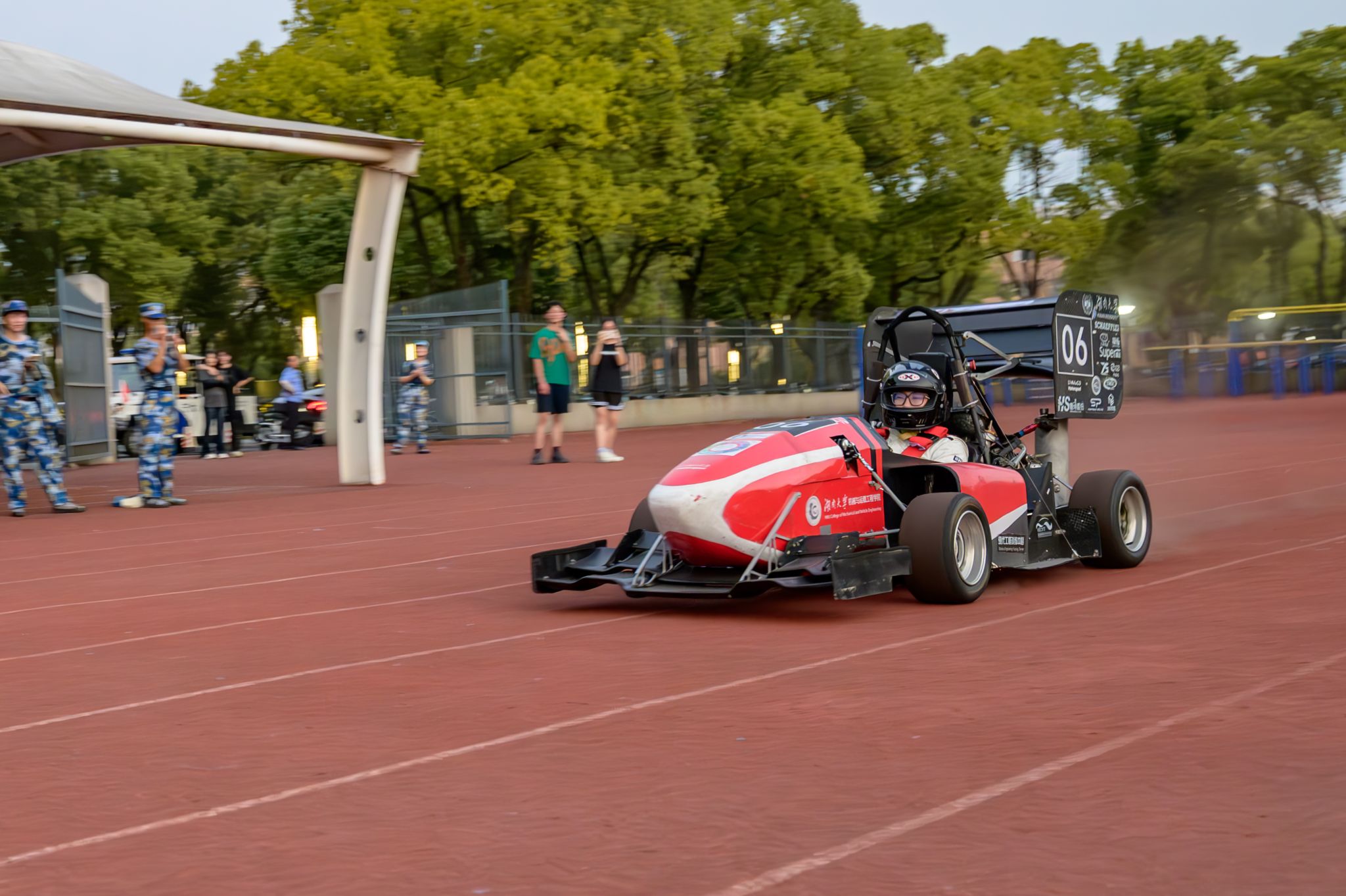 随后,赛车缓缓驶入新生军训才艺表演现场,顿时成为全场的焦点。车队队员们驾驶着HUR06号赛车,从操场后方轰鸣而出,直奔主席台前的直道跑道。发车员手中的绿旗一挥,赛车加速前进,在跑道上划出一道亮丽的弧线,展现了赛车运动的速度与激情。