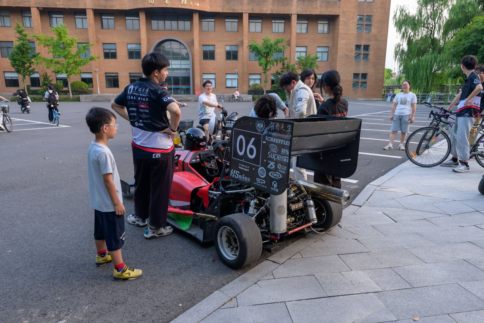 下午五点半,随着夕阳的余晖洒满校园,翱翔车队成员们紧锣密鼓地投入到赛车的整备工作中。从车身的精细调整到车手的专业装备检查,每一个细节都透露出他们对赛车的热爱与专注。随后,在包玉刚图书馆前,赛车完成了令人瞩目的漂移热车圈,其流畅的线条、轰鸣的引擎声,瞬间吸引了周围师生的目光,为即将上演的赛车展示预热了气氛。