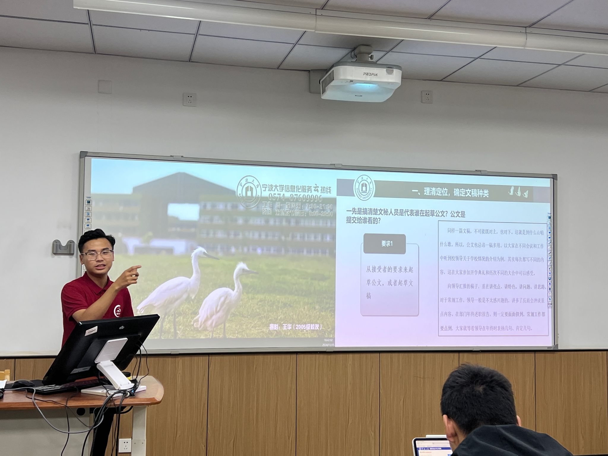 陈炫铭同学作为新闻稿与公文写作的主讲人,从五个关键点切入,帮助参训人员掌握了高效写作的方法:理清定位、理清问题、理清层次、理清版式、总结提升,他举例了多篇高质量公文,深入浅出得介绍了公文写作的重点,并鼓励同学们多写多练,“龙文百斛鼎,笔力独可抗”。