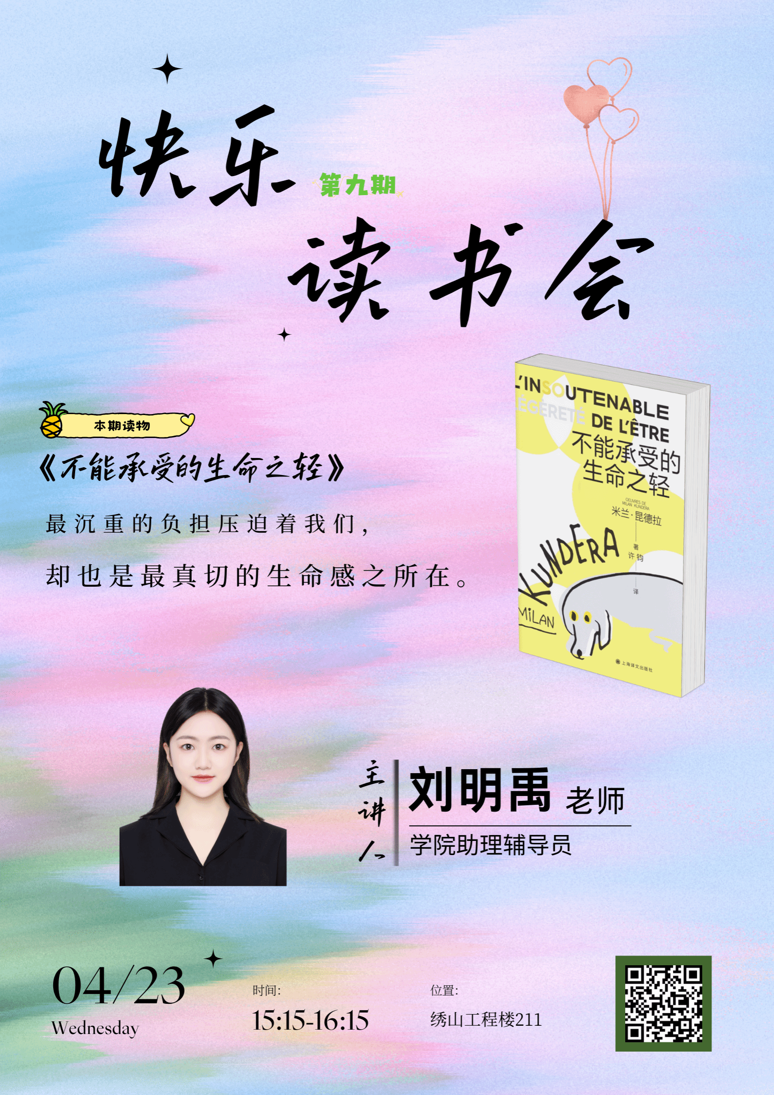 学院助理辅导员刘明禹老师在绣山工程楼为同学们领读书目《不能承受的生命之轻》,并对书中提到的“如果带着记忆生活在另一个星球,是会变得更加血腥还是更加美好”进行了交流。该活动使同学们深刻体会到了读书的重要性,也明白了养成终身读书习惯的意义所在。