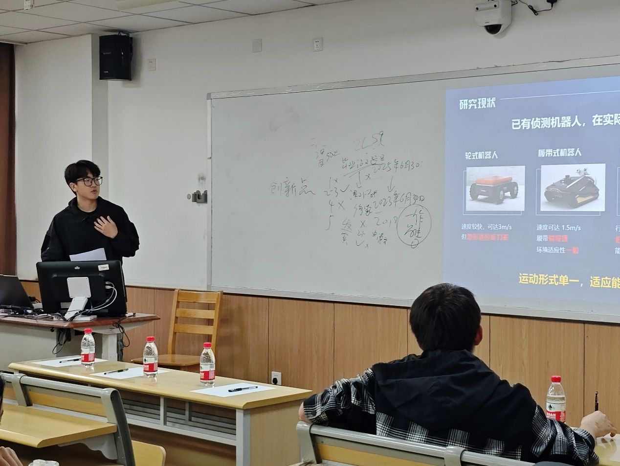 随后,蒋镇孺和张嘉泽分别代表《银光科技——电喷打印式高性能太阳能电池片开拓者》、《“蜘蛛侦探”--应用于复杂环境救援侦测的滚爬一体式智能机器人的研制》项目作分享。从项目选题、团队组建、方案设计到实践调研,展示了优秀项目的创新点和亮点,使同学们了解了赛事呈现的底层逻辑。此外两位同学还分享了在比赛过程中的经验和心得,包括如何应对突发情况、如何与团队成员有效沟通等