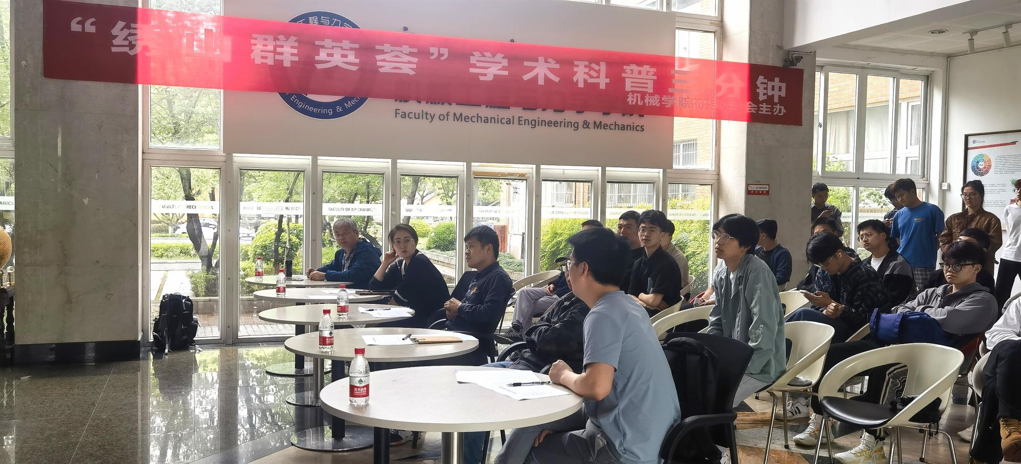 为引导同学们更加深入了解学科基础知识,4月19日下午2点,学院在绣山工程楼一楼大厅展开“绣山群英荟”学术科普三分钟活动,周风华、李科斌、任潞、林龙飞和潘晶婧五位老师担任评委。
