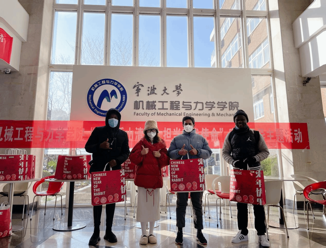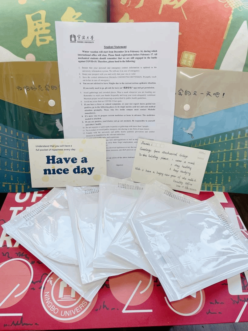 同时,学院也为每位在华留学生准备了“新春防疫大礼包”:兔年礼袋、“前兔似锦”和“大展鸿兔”抱枕、真诚图书馆文件袋、N95口罩、手写暖心明信片等,让留学生在体验中国农历兔年新春氛围的同时,也感受到来自学院的温暖与关怀。