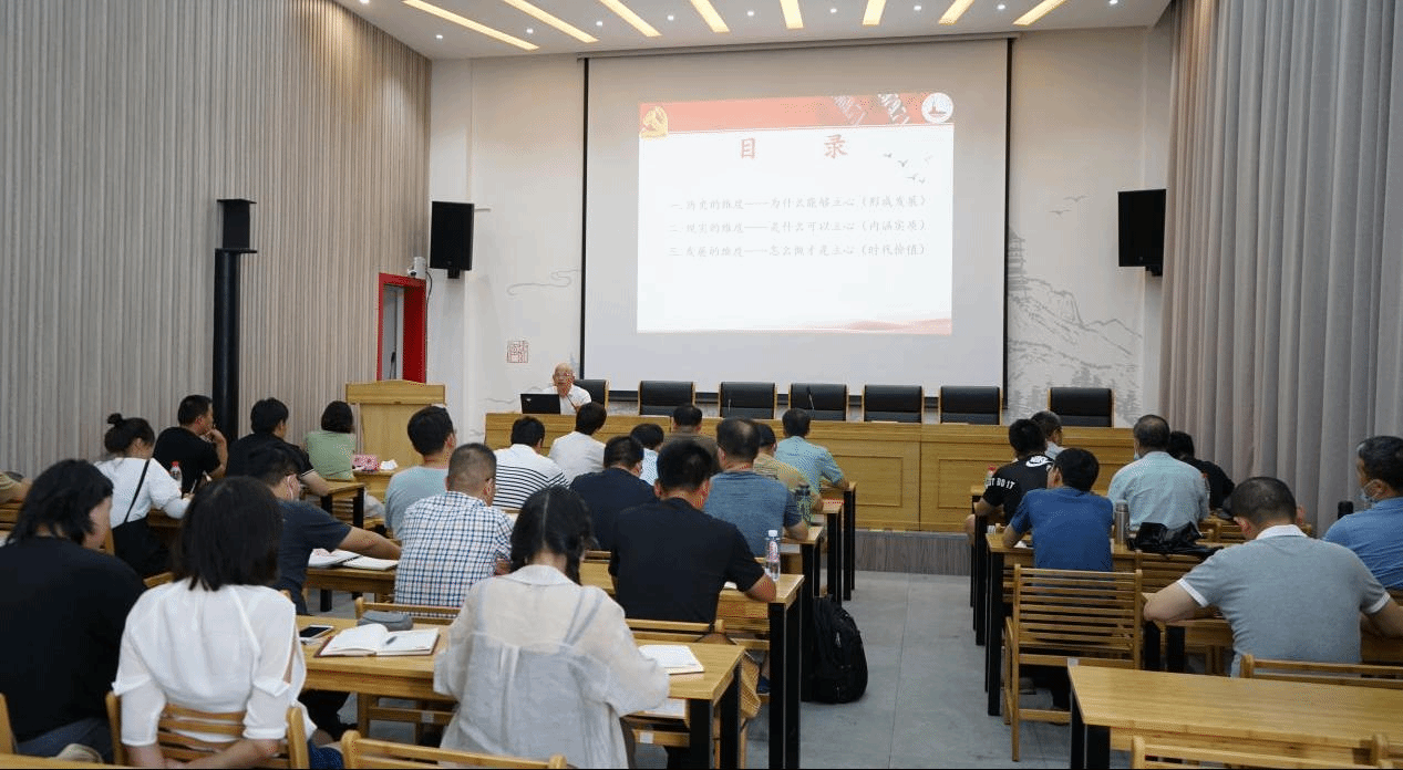 动员大会后,台州市委党校、台州大陈岛干部学院、359旅干部学院特聘教授徐纪报为全体党员上了《大陈岛垦荒精神及其时代价值》专题党课。徐纪报教授从大陈岛垦荒精神的形成发展、内涵实质及时代价值三个方面进行了详细讲述;立足历史的维度、现实的维度、发展的维度,将“艰苦创业、奋发图强、无私奉献、开拓创新”的垦荒精神进行了深入阐述;指出大陈岛垦荒精神是一面政治旗帜,与革命精神一脉相承,融入了现代社会的发展进程,充分体现了人民永远跟党走的信心和决心。