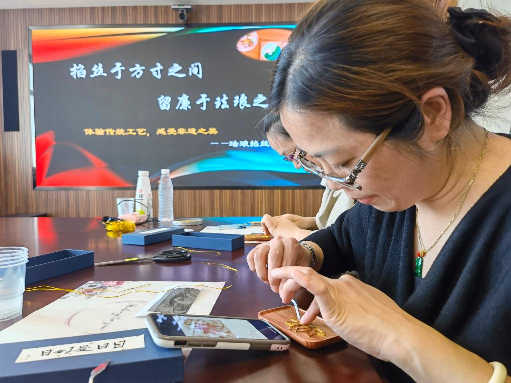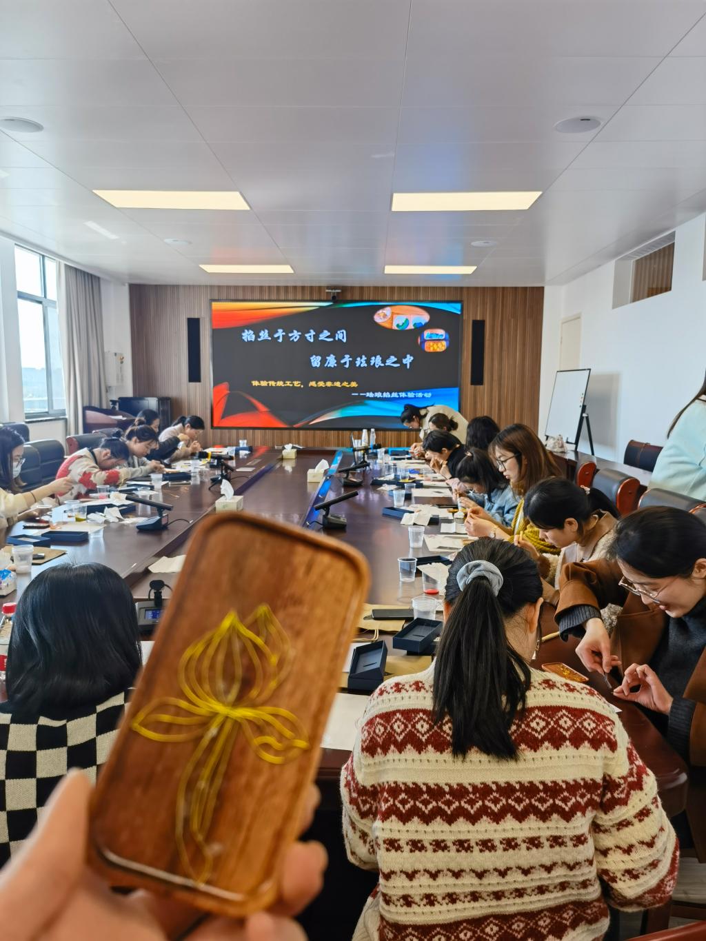 在特邀的非遗老师指导下,女教工们认真学习了“珐琅掐丝”这一传统工艺,一根根细铜丝在老师们的手里被细心掐出了不同的形状,一段段花纹又在小小的木质杯垫上勾画出了一幅幅美妙的图案,再经细沙填充赋予色彩,最后通过烧制固定成膜,变成了一件件独一无二的手工艺术作品。
