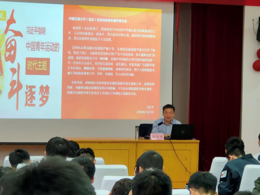 讲座最后,彭文飞副院长结合习近平总书记给中国石油大学(北京)克拉玛依校区毕业生们的回信,与同学们分享了疫情期间青年展现的使命担当和无畏奉献。同学们纷纷表示,要坚定信念跟党走,励志勤学、刻苦磨炼,努力做到又博又专、愈博愈专,以身作则,将小我融入大我,发挥好新时代青年的模范带头作用,为实现中华民族伟大复兴的中国梦奉献青春力量。