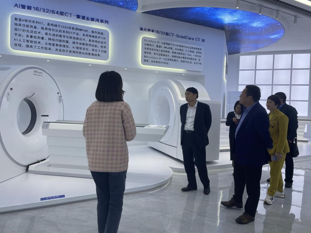 王瑶法对学院领导及校友代表一行表示热烈欢迎,并介绍了明峰医疗系统股份有限公司的发展现状。明峰医疗成立于2011年,是集CT、PET/CT、MR、PET/MR、DR、US、明峰云、人工智能AI的研发、生产、销售于一体的高科技企业,为全球客户提供尖端影像医疗设备一体化解决方案。公司拥有上百项世界领先的专利技术,被评为“浙江省引进培育领军型创新创业团队”、省级重点企业研究院——“浙江省明峰核医学影像系统研究院”、浙江省博士后工作站。先后承担科技部多个“十二五”国家支撑项目和“十三五”国家重点研发专项。