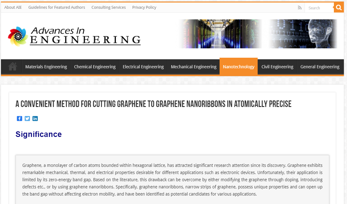 易利军副教授关于石墨烯原子精度裁剪的研究成果被Advances in Engineering(AIE)遴选为关键科学文章