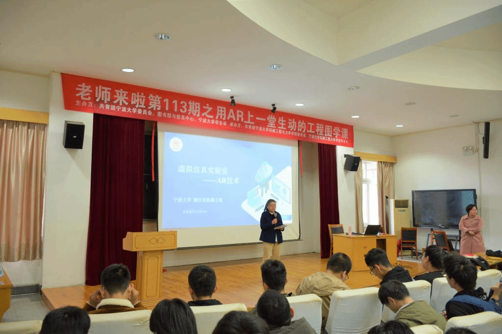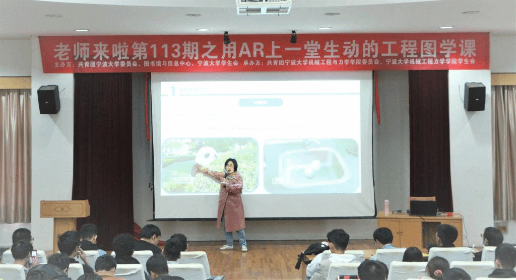 老师来啦第113期之用AR上一堂生动的工程图学课在绣山工程大楼三楼报告厅顺利举行。NBU机械工程虚拟仿真教学实验室指导老师王英副教授受邀担任主讲人,给宁大学子分享AR数字化虚拟仿真技术,现场演示了技术的应用,同时向大家分享了她的留学经历,并答疑解惑。