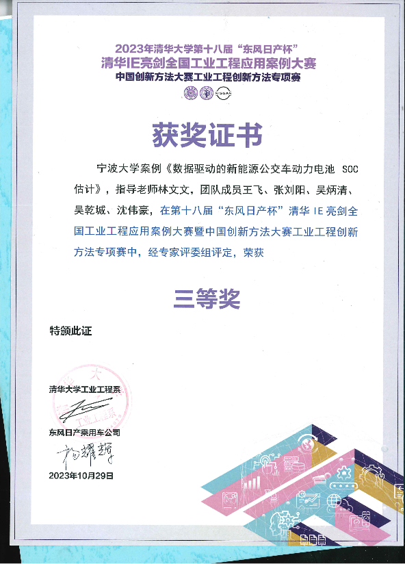 工业工程系在此次大赛中共有五组报名项目参赛,由林文文,任潞,王瑞,余军合作为指导老师,李涛,王飞,朱铭铭,冯高松,谢珊珊等学生作为带队学生共同参加。获得了两项三等奖,分别是“数据驱动的新能源公交车动力电池SOC估计”和“双碳背景下的企业镀层精益质量改善”。
