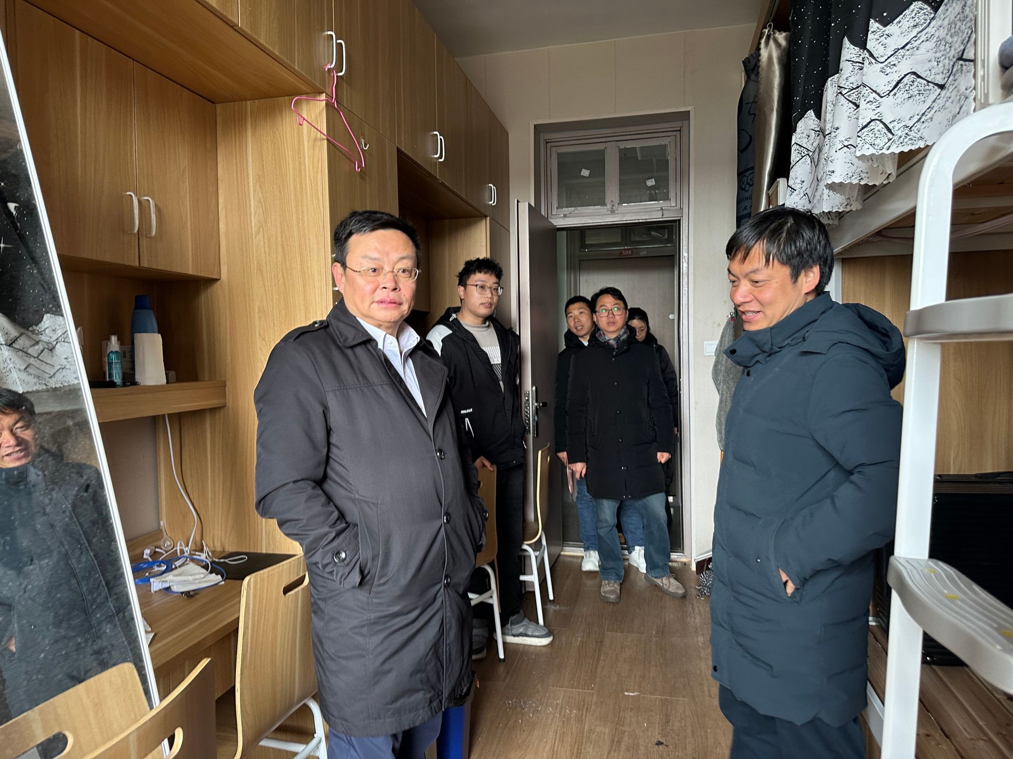 在走访学生寝室的过程中,学院领导重点关注学生宿舍用电安全以及消防安全问题,着重检查寝室电源、走廊线路以及室内用电等情况,格外叮嘱使用电瓶车的同学切勿违规充电。针对新学期的学习生活,向学生们提出了一些建议和期望,呼吁提高防诈反诈意识,传授反诈技巧,在人身安全和财产安全等多方面打下双保险。