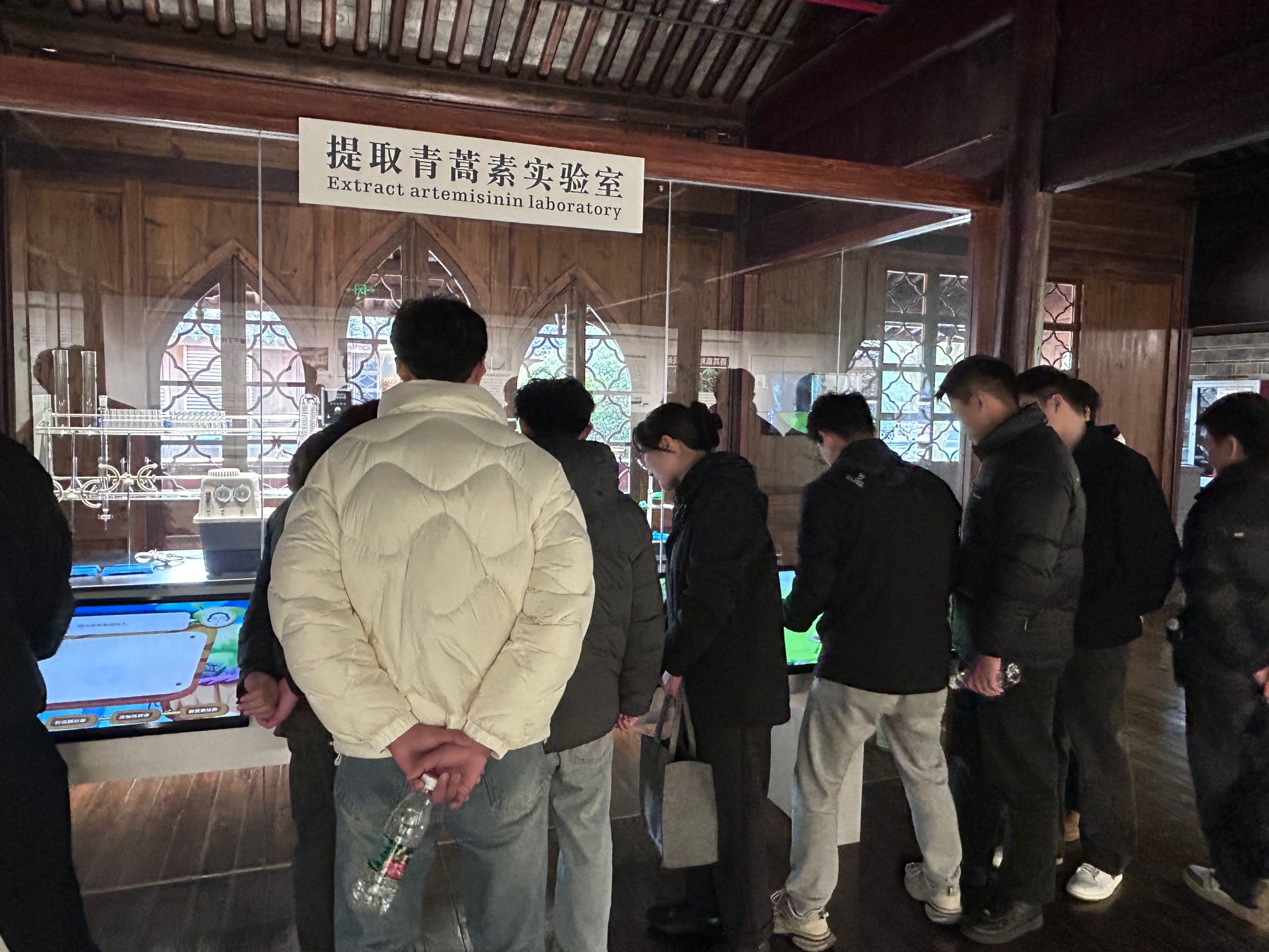 活动开始之前,各位成员提前认真查阅资料,学习了解屠呦呦女士的生平和成就。参观过程时,各位成员分成五组,负责了解相应的展厅内容,依次向大家介绍屠呦呦女士的早年生活和学术背景,以及科研成果、医学贡献和荣誉奖项等方面的内容,互相交流分享对屠呦呦女士的认识和了解,讨论着她在医学领域所做出的卓越贡献。陈列馆二楼主要设有中医药专家研究室、培训活动室和学生科普基地。成员使用“提取青蒿素”及“青蒿灭蚊”等多媒体互动软件,参与提取青蒿素的实验过程,充分体会了青蒿素提取的来之不易。