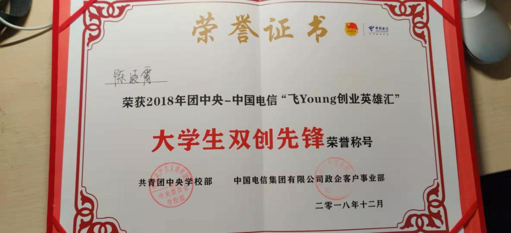 陈凌霄同学在2018年团中央——中国电信“飞Young创业英雄汇”活动中,荣获“大学生双创先锋”荣誉称号。