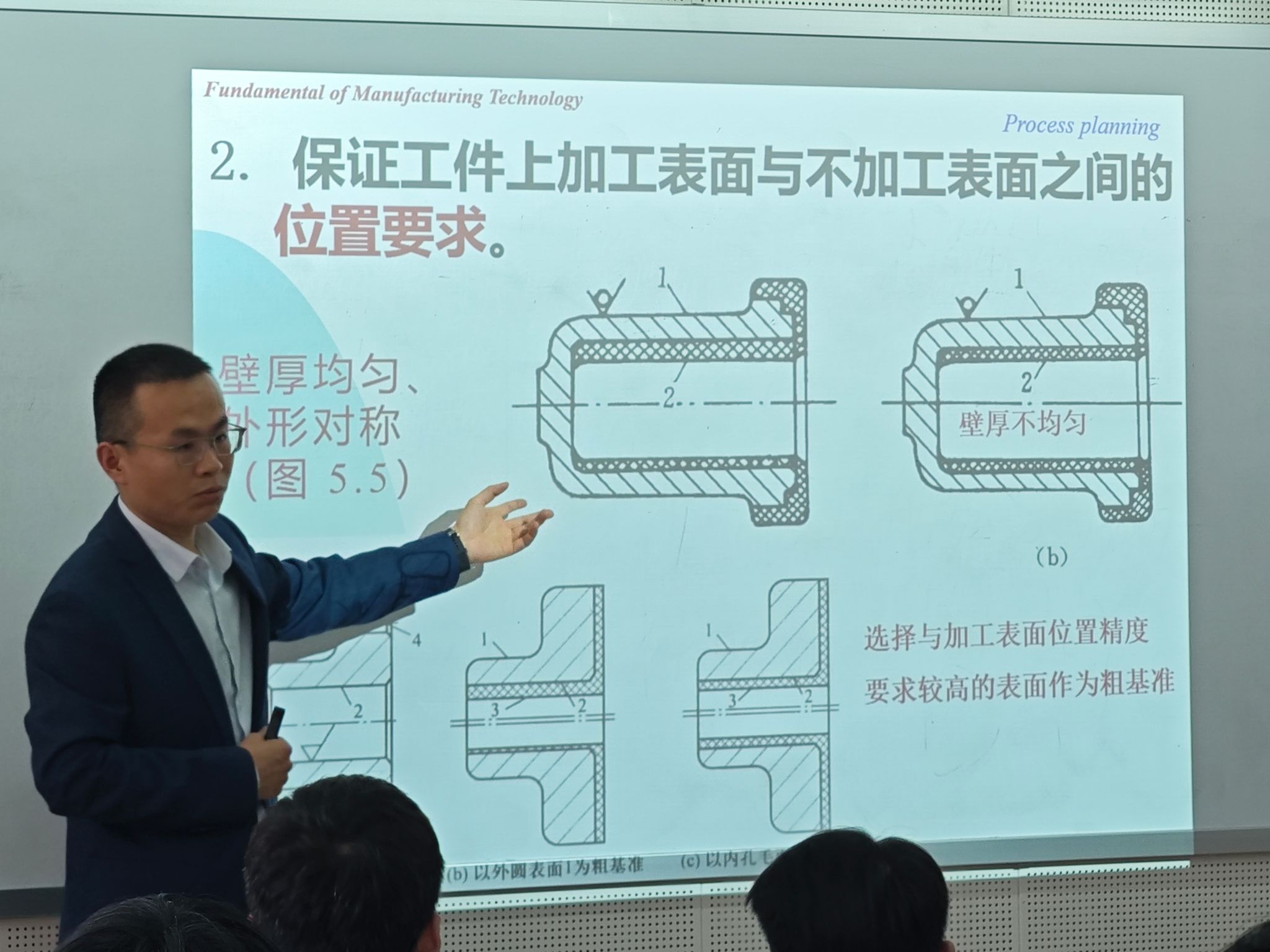 本次课程主要讲授机械制造技术基础相关的知识,李凯老师课堂上为同学们介绍了定位基准选择、表面加工方法选择、加工阶段划分、确定工序集中与分散、加工顺序安排、机床选择等制订机械加工工艺规程的主要内容,将“高铁轴承国产化替代”、“华为自研光刻机”等不断追求自主创新的工匠精神融入课程。学生在获得专业知识的同时,也认识到中国企业在面对技术封锁时所展现出的韧性和创新力。授课过程中,李老师积极与学生互动,调动学生的学习热情,引导同学们对课程内容积极思考。课程最后,李老师对同学存在的问题做了耐心解答。