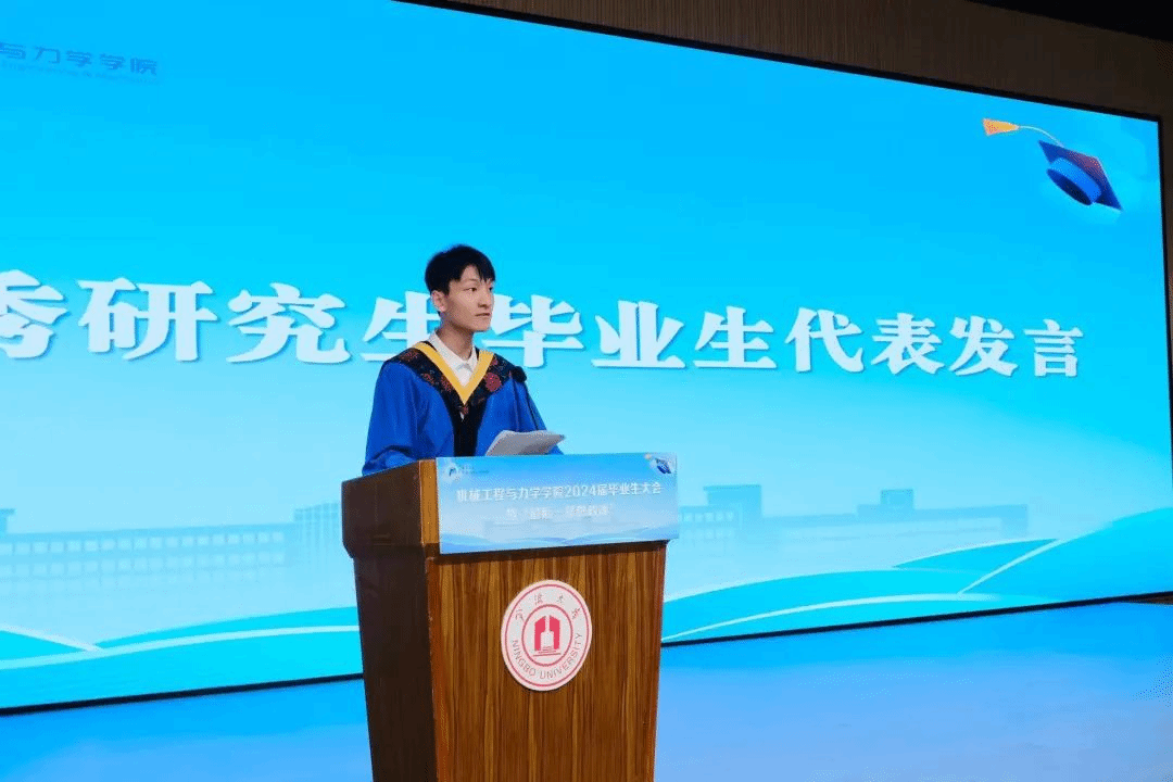 优秀毕业生代表2021级力学硕士研究生蒋昊成、2020级机械国贸专业本科生颜路晨上台发言,他们以真挚的情感和坚定的声音分享了自己在学院学习和成长的经历,并对学院的培养表示衷心的感谢。