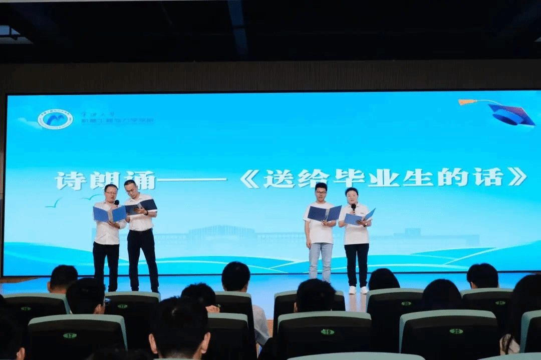 诗歌《送给毕业生的话》,由学院本科生班主任和研究生导师代表共同创作并朗诵,老师们用诗意的语言向毕业生们传达了最美好的祝愿和期许,赢得了现场阵阵掌声。