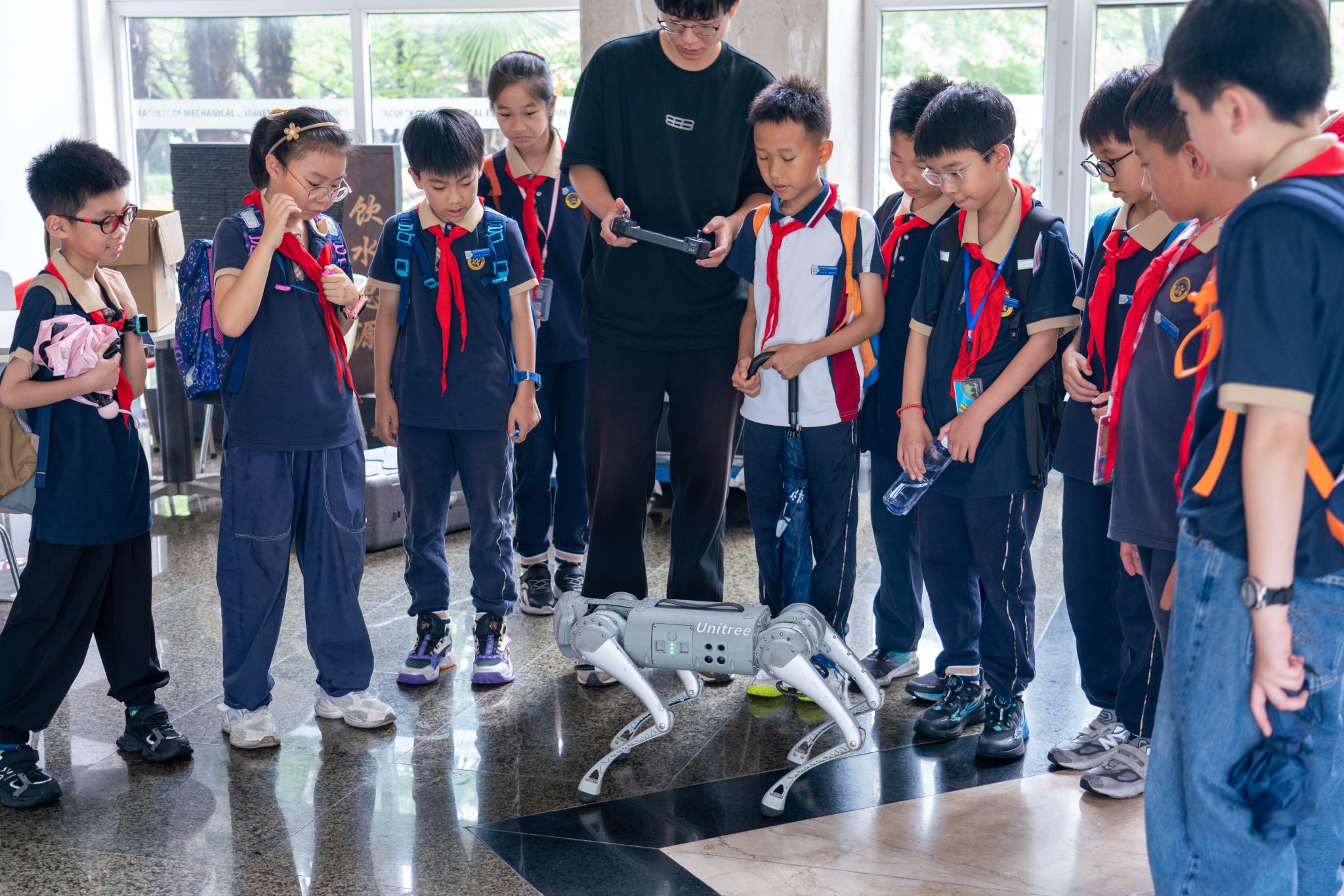 研学之旅的最后一站,是会对抗的“步兵”和会跳舞的“机械狗”。机器人创客俱乐部的社长武荣鑫详细介绍了俱乐部自主设计制造的步兵机器人,它由底盘和云台组成,底盘装有四个麦克纳姆轮,能够进行复杂的运动;云台架部分通过电机连接底盘,可以自由旋转,发射机构则安装有弹仓和枪管,甚至可以安装摄像头,瞄准并发射弹丸。2023级机械专业研究生王逸航同学则带来了机械狗的舞蹈表演。Go1机械狗,作为全球首款伴随机器人,以其最高可达17Km/h的奔跑速度,翻身避障,走楼梯,甚至人体自动跟随等功能,展现出了科技的无限可能。在介绍过后,孩子们迫不及待地亲自操控,控制着“机械战车”进行急速前行、漂移和急停,引导着“机械狗”奔跑、跳舞,将科普工作从有意义转化为了生动有趣。
