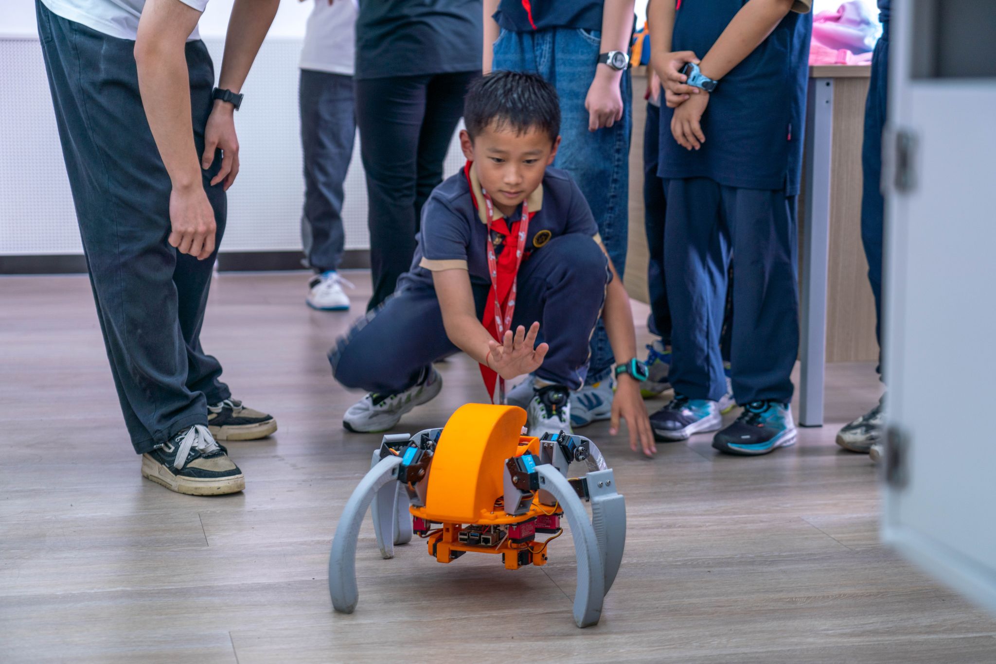 研学之旅的第一站,是21级机械设计制造及其自动化专业的党涛学长带来的科研项目展示——《蜘蛛侦探:一款为复杂环境救援侦测而生的滚爬一体式智能机器人》。他从消防中队的实地考察中汲取灵感,将“蜘蛛侦探”从1.0版本逐步升级至4.0版本,并在现场邀请小朋友们亲身体验这款机器人的自动避障、自动调平、视觉交互等特殊功能。