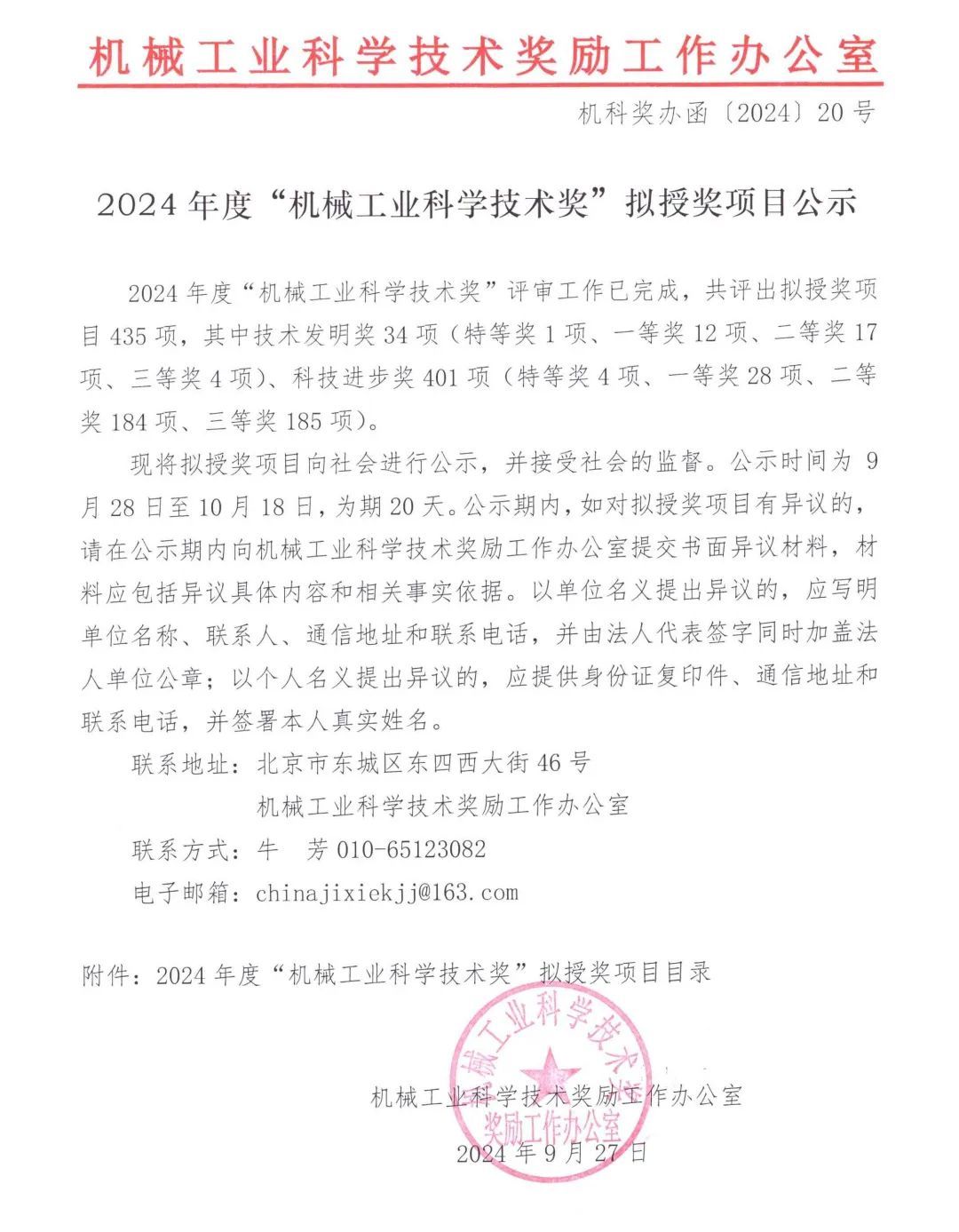2024年度“机械工业科学技术奖”拟授奖项目公示,成人动漫