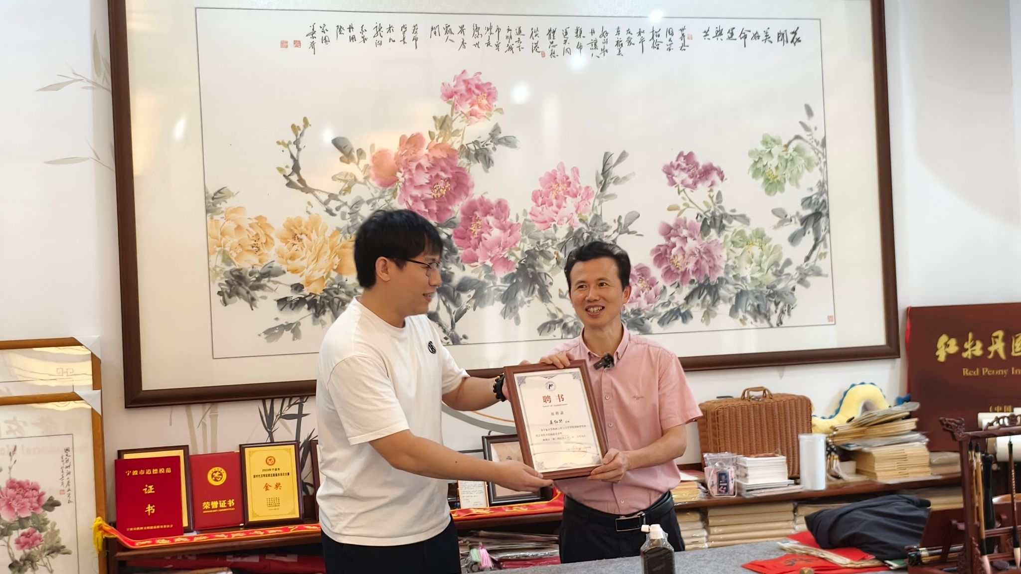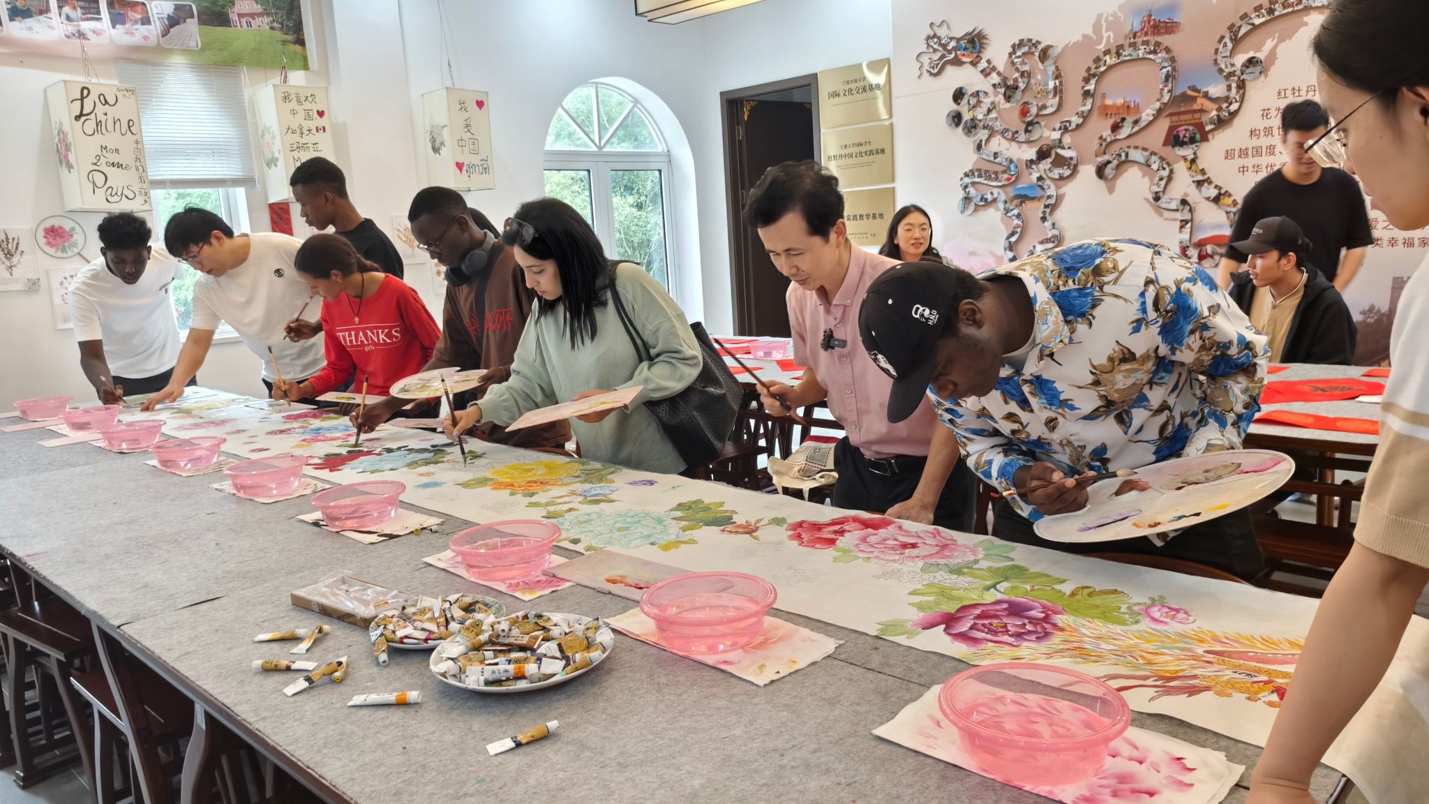 宁波红牡丹书画国际交流社创始人、宁波开放大学红牡丹学院院长姜红升用英语授课,在绘画牡丹的示范过程中,姜老师声情并茂,生动地讲解了牡丹的线条、墨色和构图,让学生们领略到中国传统艺术的精妙。他还鼓励学生们亲手实践,用心感受笔触与色彩的交融,共绘75朵牡丹画卷。在之后的书法体验活动中,每一位学生都认真地在宣纸上书写自己的作品,使出“浑身解数”,一撇一捺,体会汉字的结构之美。在姜老师的细心指导下,“神州盛世”、“国庆快乐”跃然纸上。