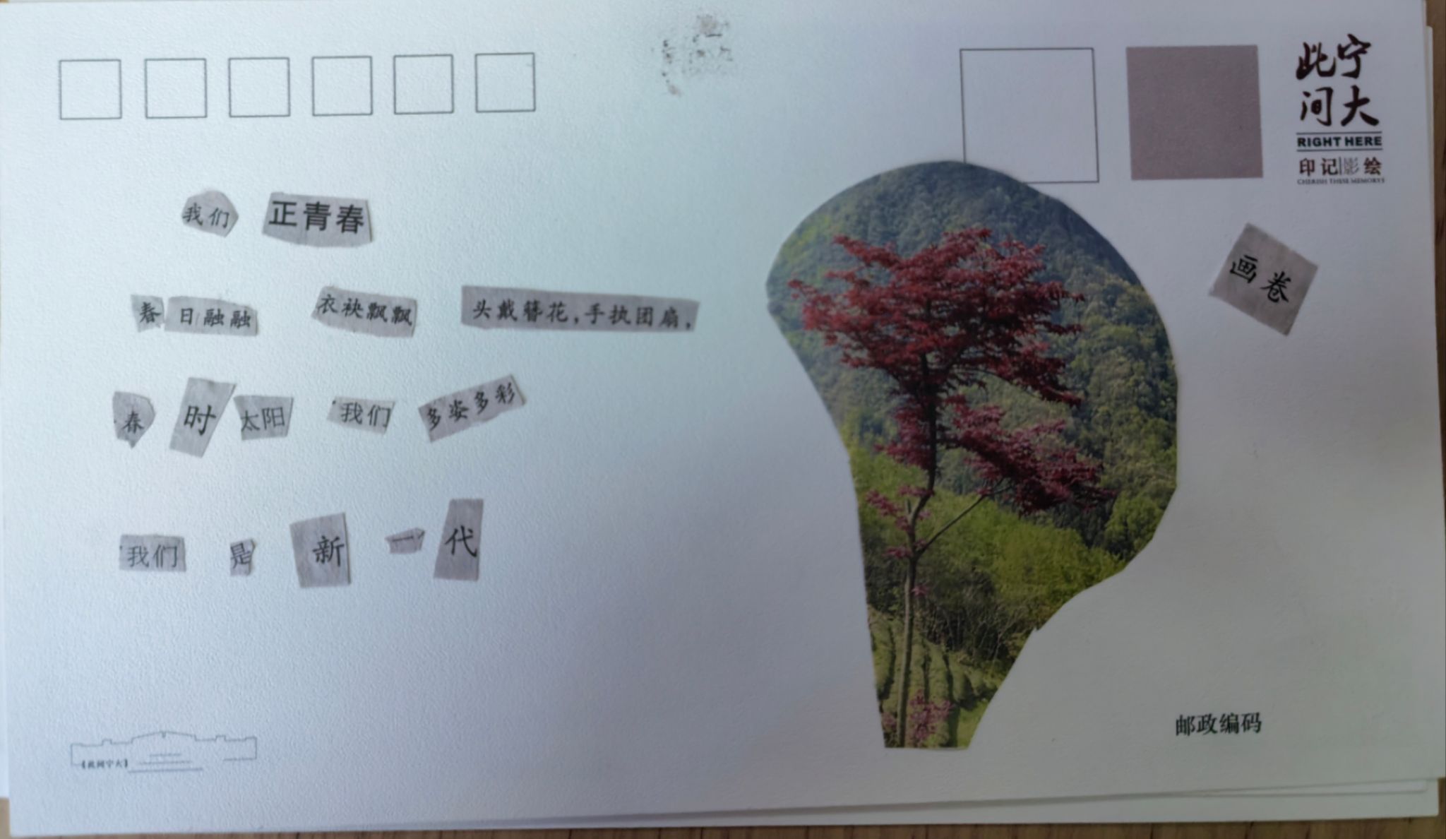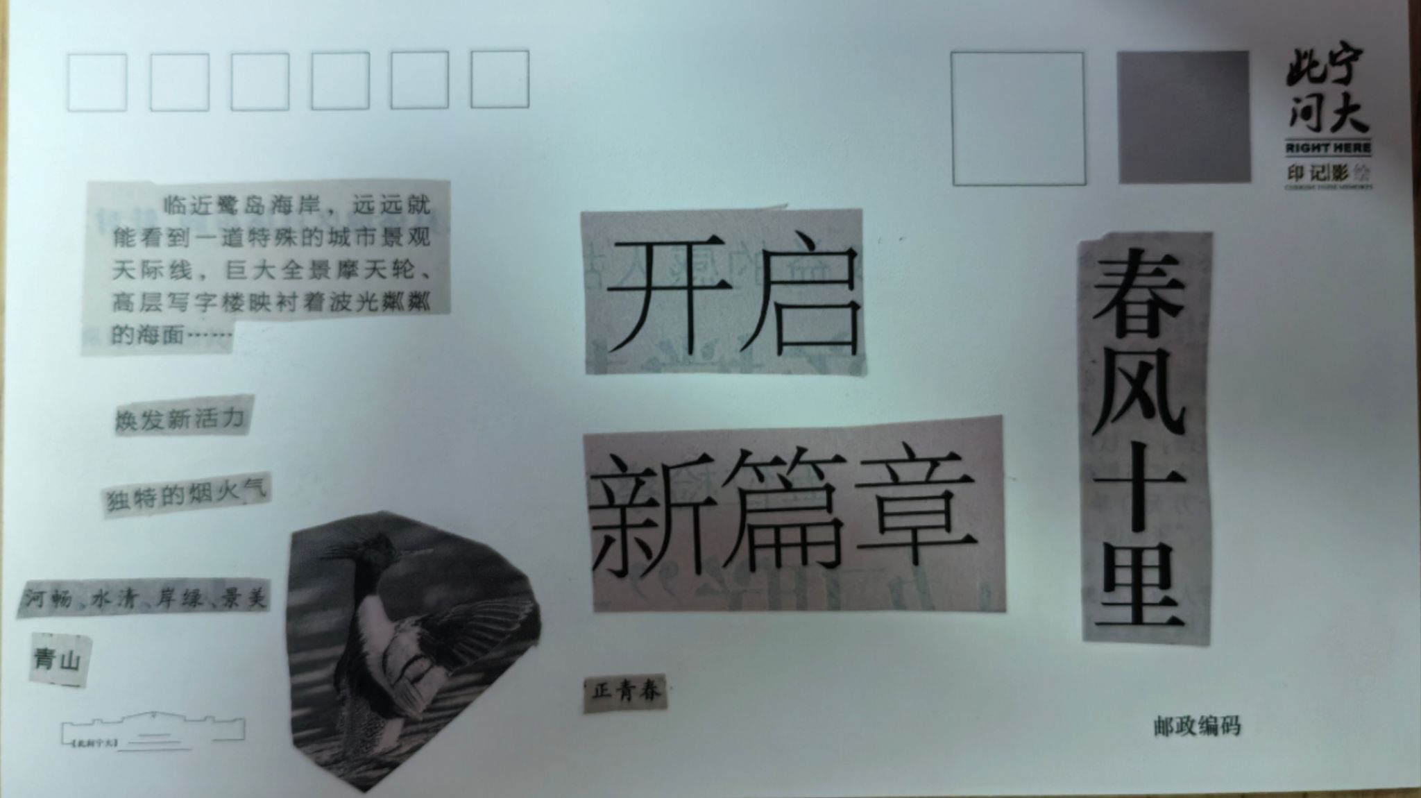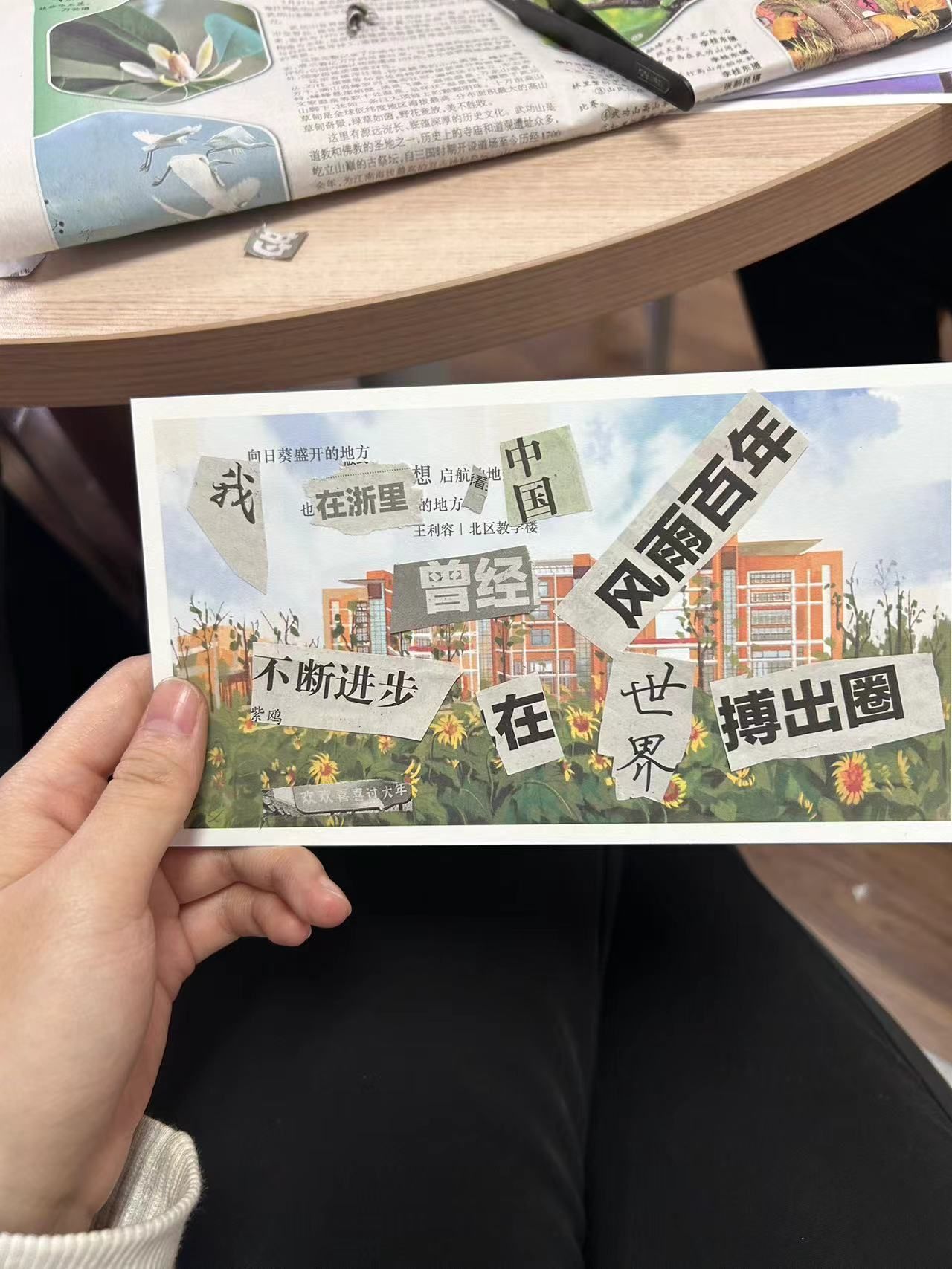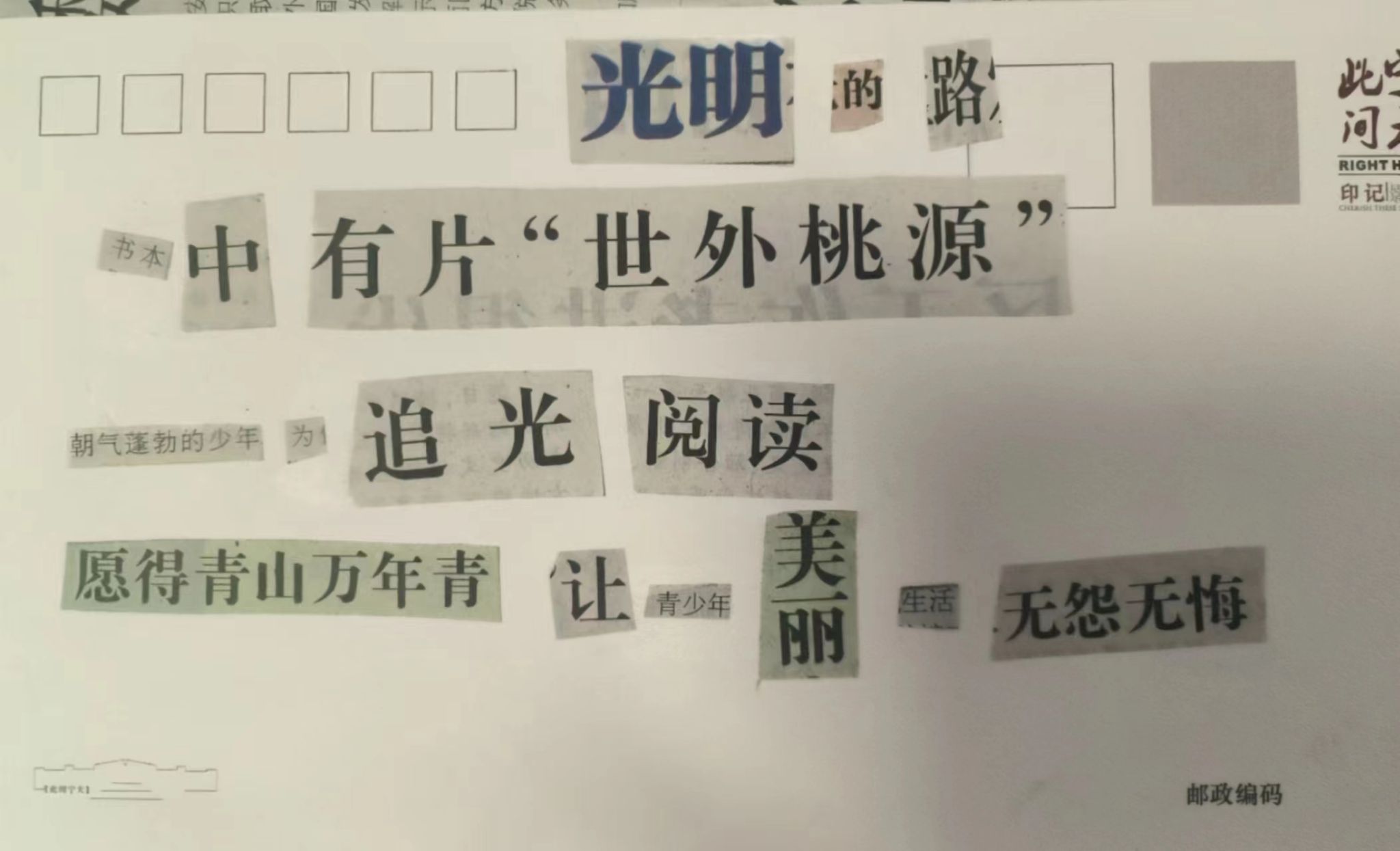在活动中,同学们将报纸上的字、词和语句剪裁下来组成一首小诗或者一幅有意义的图画。大家互帮互助,互相交流自己作品的立意、语句的选择和色彩搭配的巧思,完成了许多内涵丰富,构图精巧的作品。