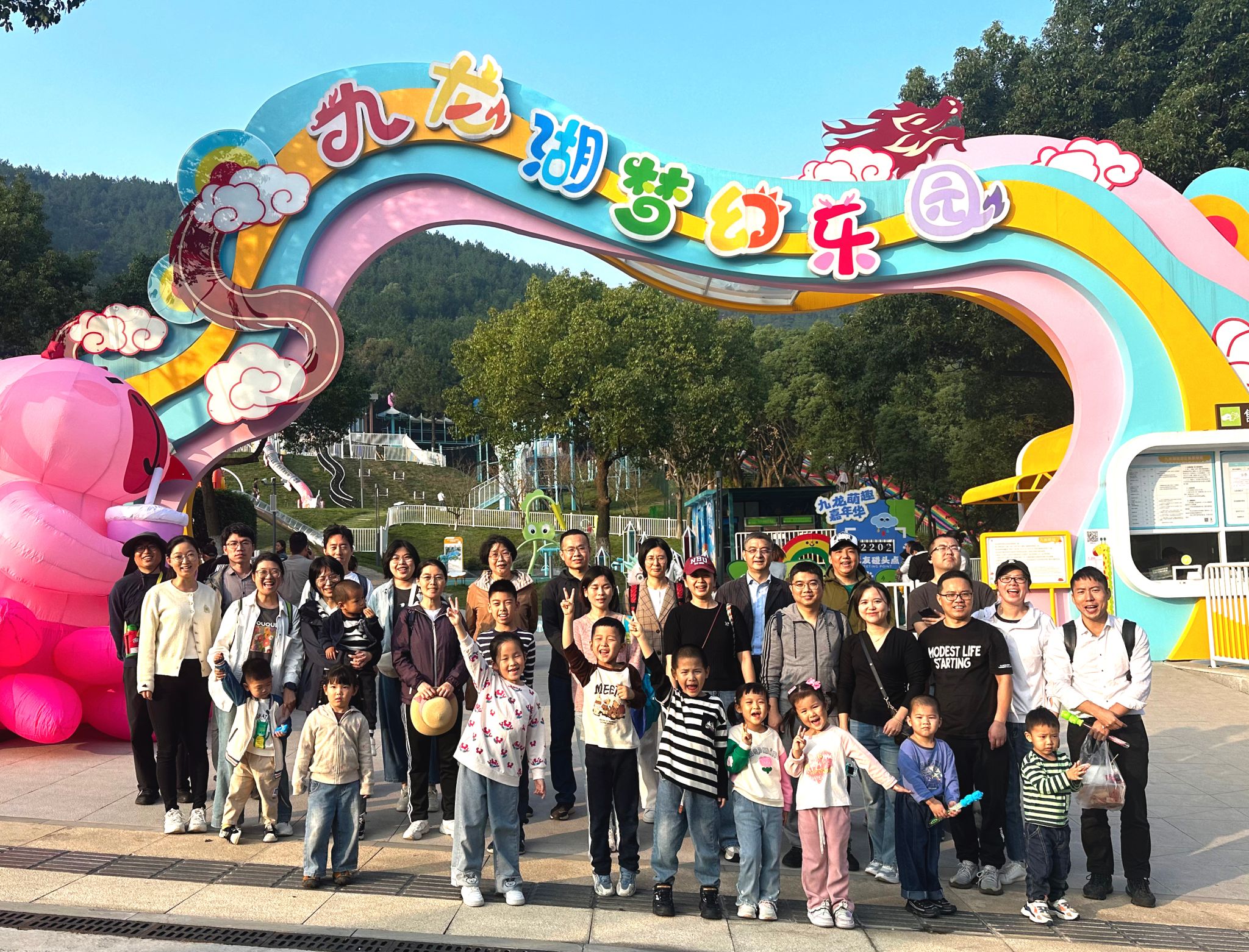 上午,大家一同游览了九龙源及周边景区,不时赞叹“山峰环抱、翠岭逶迤、波光如镜”美景。在环湖健步道上,大家一边欣赏着湖光山色,一边享受着慢运动快乐。下午,大家根据兴趣选择了不同路线。在梦幻乐园的亲子乐园和研学拓展乐园内,家长与小朋友一站式体验了生态休闲、亲子游乐、亲子运动和科普教育。另外在船游猴岛路线中,大家登岛远眺,波光蓝天一色,绿树修竹相映,景色极为旖旎。岛上可爱的猴子和各种小动物也吸引大家驻足观看,带来了别样体验。