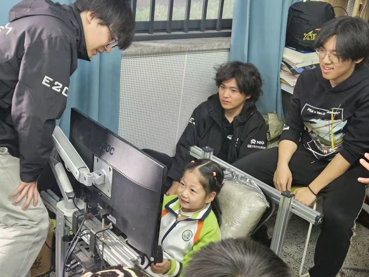 随后,在车队实验室,队长黄一鸣详细介绍了赛车E20的制作过程,请小朋友们亲身体验了赛车制作工艺和严谨流程。模拟器驾驶环节将气氛推入高潮。小朋友们兴奋地坐上了模拟驾驶座椅,“调节座椅,握紧方向盘,紧盯每一个弯道”。在仿真的赛车在屏幕上飞驰,孩子们仿佛真的成为了一名小小赛车手,感受围场中的速度与激情。