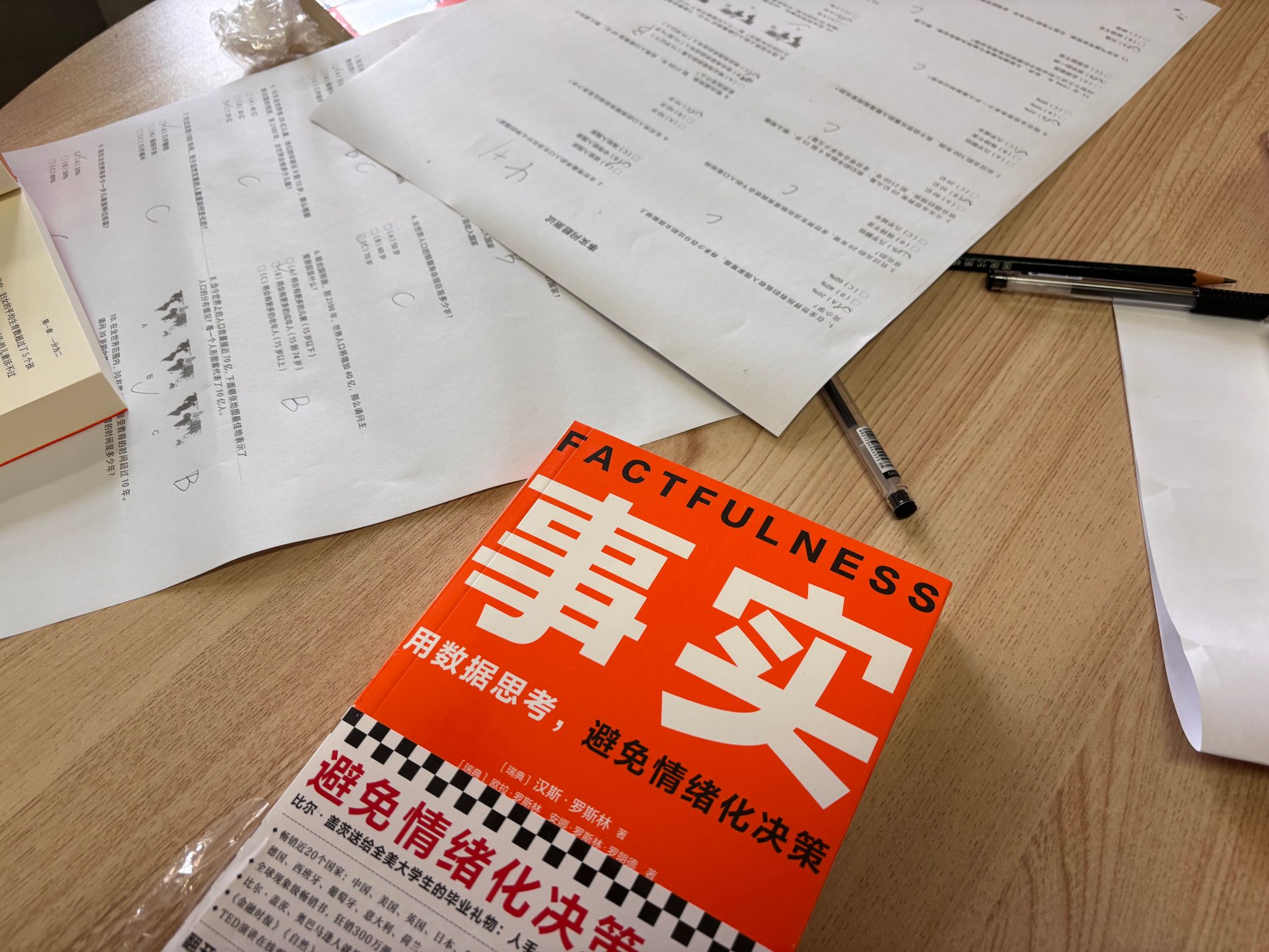 读书会伊始,谢老师首先发给同学们一张测验表格,“这个表格是考你们对世界基本认知的。世界很多知名的人物都做过这个表格,比如比尔盖茨、奥巴马等等,在座的同学可以试一下。”同学们跃跃欲试,基本上两三分钟可全部答完,但结果却出乎意料——面对“目前人类的生活是越来越好还是越来越坏”这类简单题,正确率也不足三分之一,大家不免有些气馁。