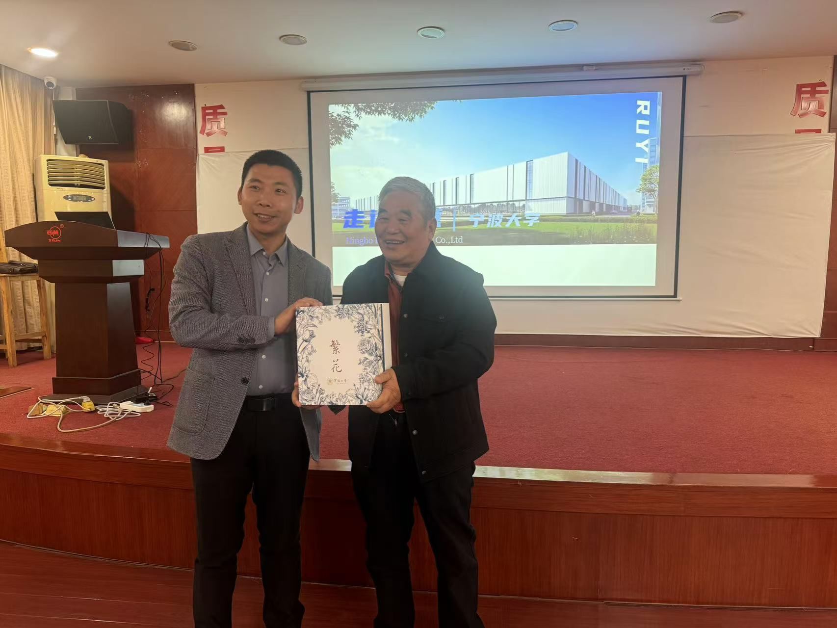 活动伊始,双方举行学习交流座谈会。会上,宁波如意股份有限公司创始人、名誉董事长储吉旺代表企业向远道而来的宁大师生表示热烈欢迎,并为大家上了一堂生动的“职涯素养课”。作为一名退伍军人、中国老一辈民营企业家代表,储吉旺董事长简要介绍了如意股份的发展历程和业务范围,畅谈了有关如何办好企业与实现产品创新的体会感悟,并结合自身与历史名人的成长经历,向在座同学表示要经受得住磨难,坚持辛苦学习、自我奋斗,始终将创新研发一以贯之,热切希望更多的宁大学子来企业就业工作和生活。