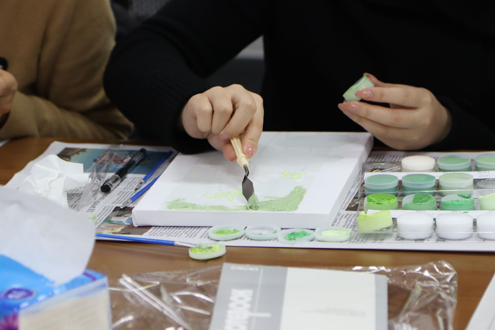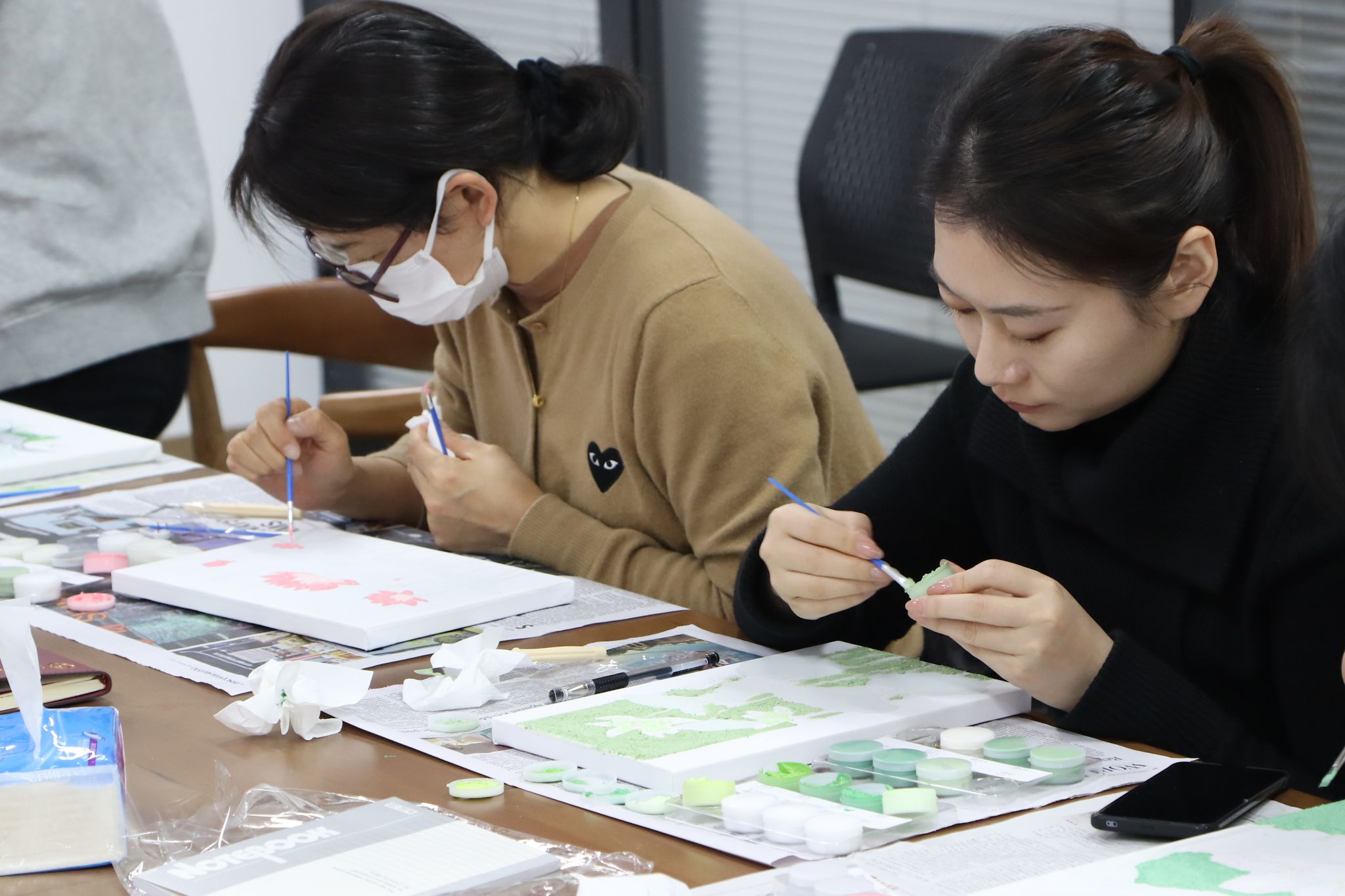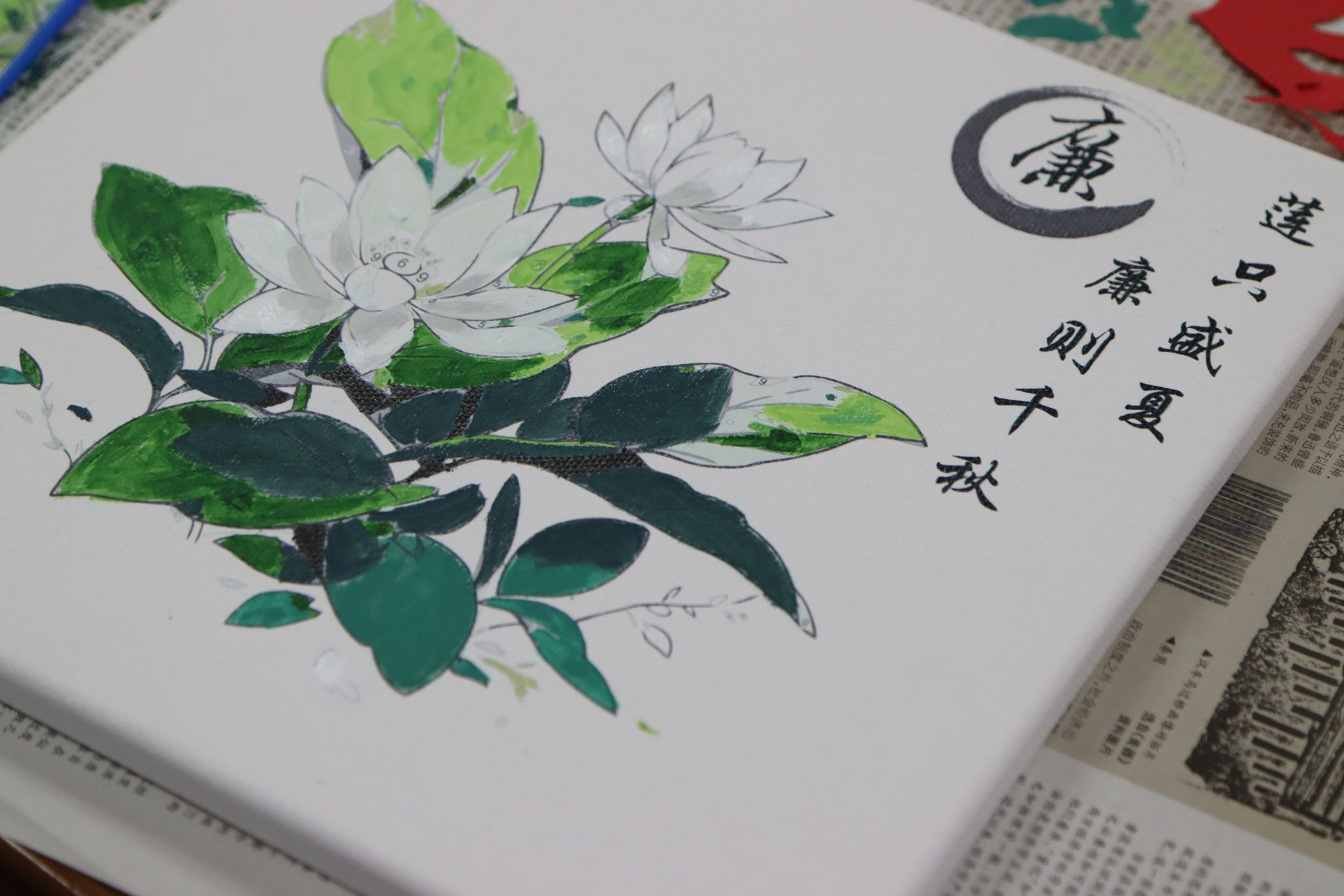 大家以肌理画与水彩的形式,绘就了一幅幅廉洁主题的画作。从山水间的清风徐来,到人物形象的廉洁奉公,每一笔都透露出对廉洁文化的深刻理解和热爱。有的用淡雅的色调绘出山间清泉,清澈的水流仿佛流淌着廉洁的气息,寓意清正如水;有的勾勒出出淤泥而不染的荷花,坚韧的姿态好似坚守廉洁底线的不屈精神;有的以大字“廉”展开,主题凸显又不失创意与美感。大家沉浸其中,边画边交流对清廉的感悟,整个空间充盈着廉洁文化的氛围。