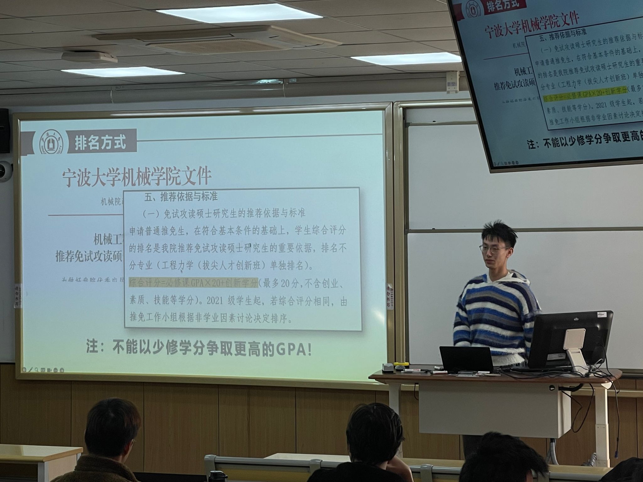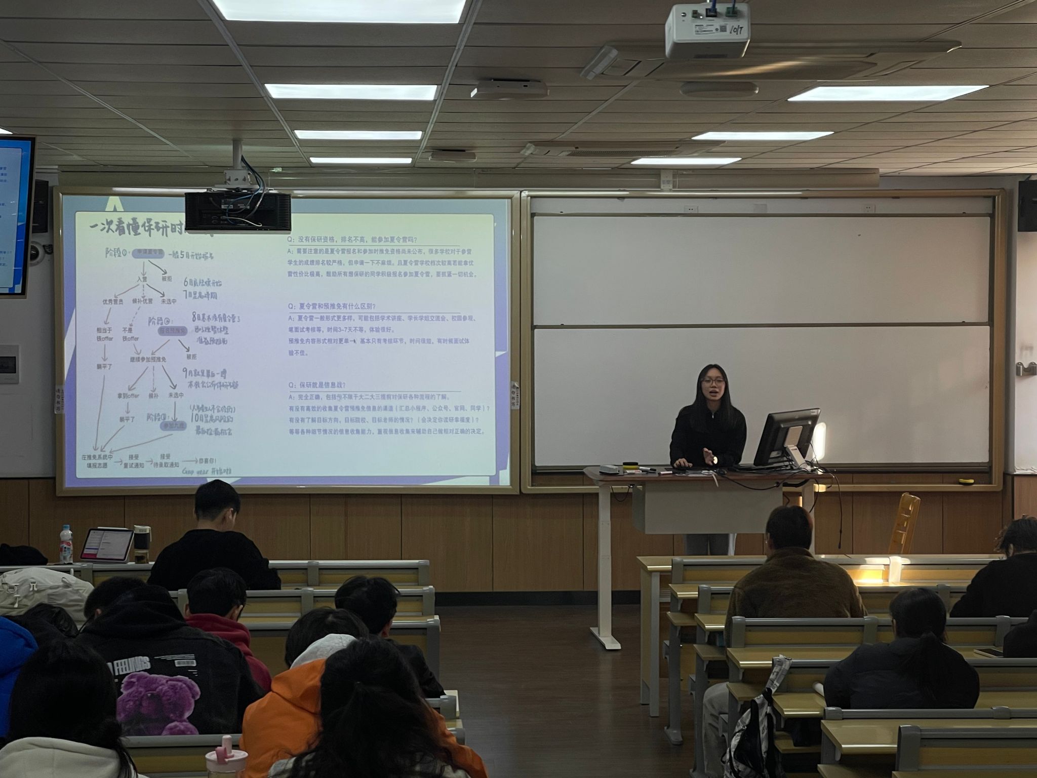 本次分享会,共邀请了学院来自2021级机械设计制造及其自动化、工程力学、工业工程、车辆工程、机械国贸和智能制造工程6个专业班级的同学进行分享介绍,吸引了全院60余位同学到场参与。活动中,学长学姐们结合自身经历,详细阐述了学院目前的研究生推免政策,以及保研的流程和时间线,从申请材料的准备、夏令营的报名到预推免的安排等方面逐一讲解,并强调了英语四六级成绩、创新学分、必修课成绩和科研能力的重要性,建议大家提前准备好个人陈述、推荐信、成绩单和排名证明等佐证材料。活动现场座无虚席,氛围轻松热烈。与会学生围绕目标院校与考研机构选择、信息查询、面试技巧等问题进行交流与互动。