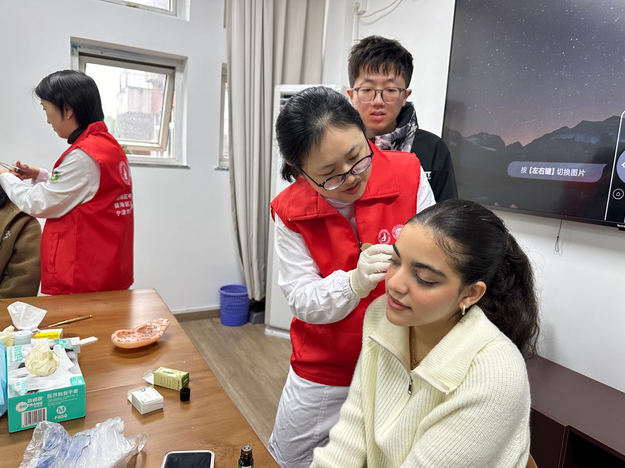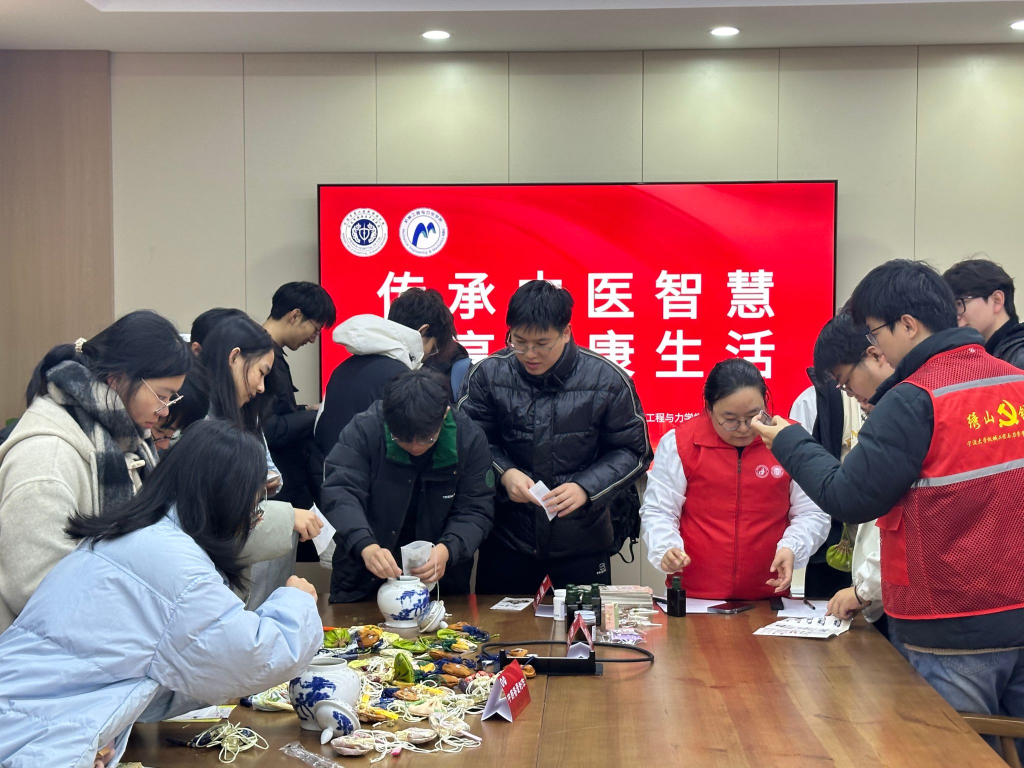 活动现场被精心划分为两个分会场:传统疗法体验区和中医文化互动区。在传统疗法体验区,设置了“针灸体验区”“耳穴体验区”“穴位贴敷体验区”和“耳部刮痧体验区”。中医医师们逐一为同学们带去针灸的微妙、耳穴的神奇、穴位贴敷的舒适以及耳部刮痧的放松。他们细致入微的手法,让同学们感受到了中医传统疗法的独特魅力。在“中医把脉体验区”,医师们通过精准的脉象诊断,为同学们解读身体状况,并提供了个性化的健康建议。学生们纷纷表示,这些体验让他们对中医有了更直观、更深入的了解,对中医的智慧深感敬佩。在中医文化互动区,“中药香囊制作”和“中药临方炮制产品”两个环节同样吸引了大量同学参与。在医师们的指导下,同学们亲手制作香囊,了解中药炮制的过程,体验到了中药文化的独特韵味。此外,“八段锦带练体验区”更是热闹非凡,同学们在医师的带领下,认真学习每一个动作,感受中医养生运动的魅力。大家纷纷表示,这样的活动不仅让他们学到了中医知识,还让他们在忙碌的学习生活中找到了放松身心的方式。中医的文化魅力还吸引了不少留学生前来体验,留学生们对于穴位和体部位的映射感到好奇,对中医文化的敬佩之情油然而生。