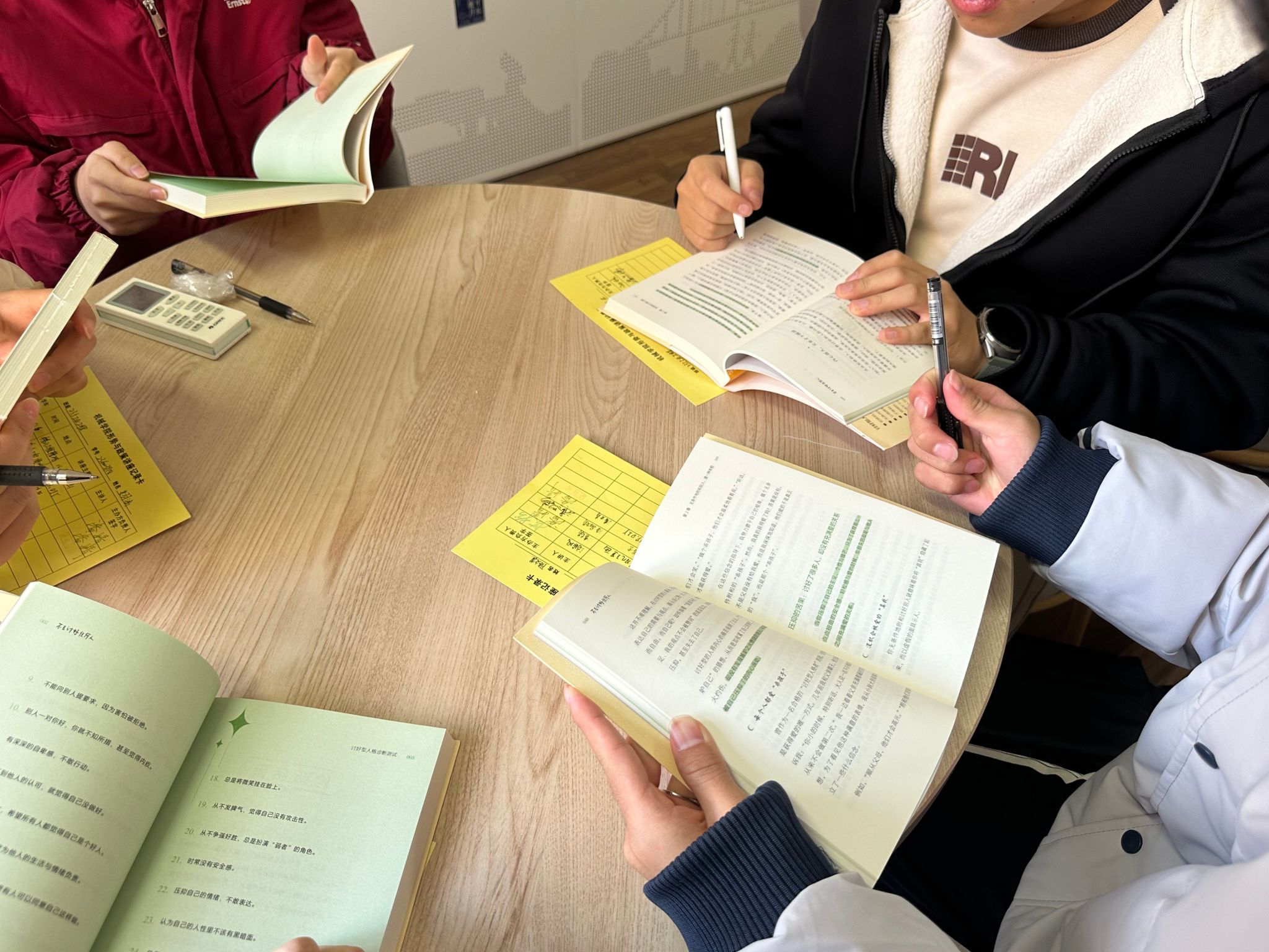 读书会伊始,钱老师以读本中的26道测试题题,测试同学们的“讨好型人格”程度,并分享了自己该测试的结果,以及在读完该书前后测试成绩的变化,并直言在这本书中看到了曾经的自己。钱老师以自身为引,打开了大家的话题,同时引起了同学们对这本书的兴趣,读书会的气氛很快被烘托起来,同学们热情交流,研三的同学还分享了一些求学过程中的实际问题并现场展开讨论。