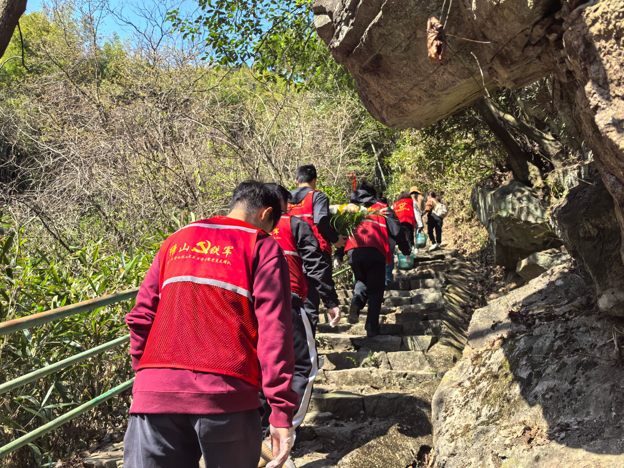 第四年组织成员前往该地开展主题党日活动。每一次踏上这条承载革命记忆的道路,都是一次精神的洗礼。支部成员与海曙阳光公益团队成员沿着古道拾级而上,敬献鲜花,清扫道路。