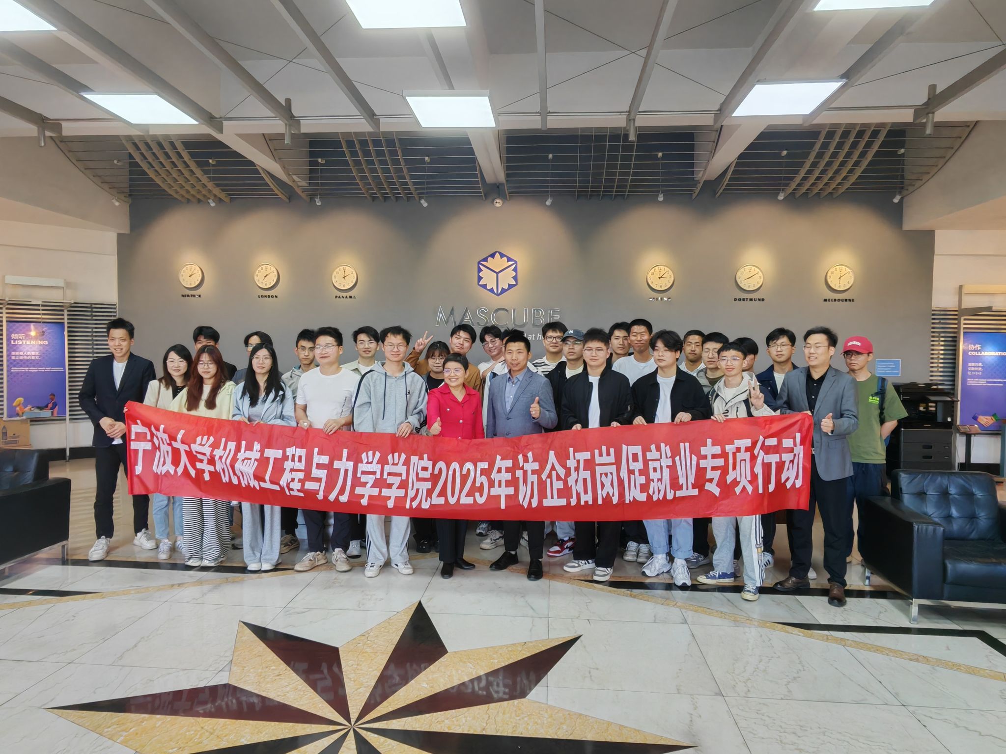 学工办洪松、钱锦等师生一行20余人前往宁波美博进出口有限公司北仑总部(简称“美博集团”)开展“访企拓岗”促就业专项活动。
