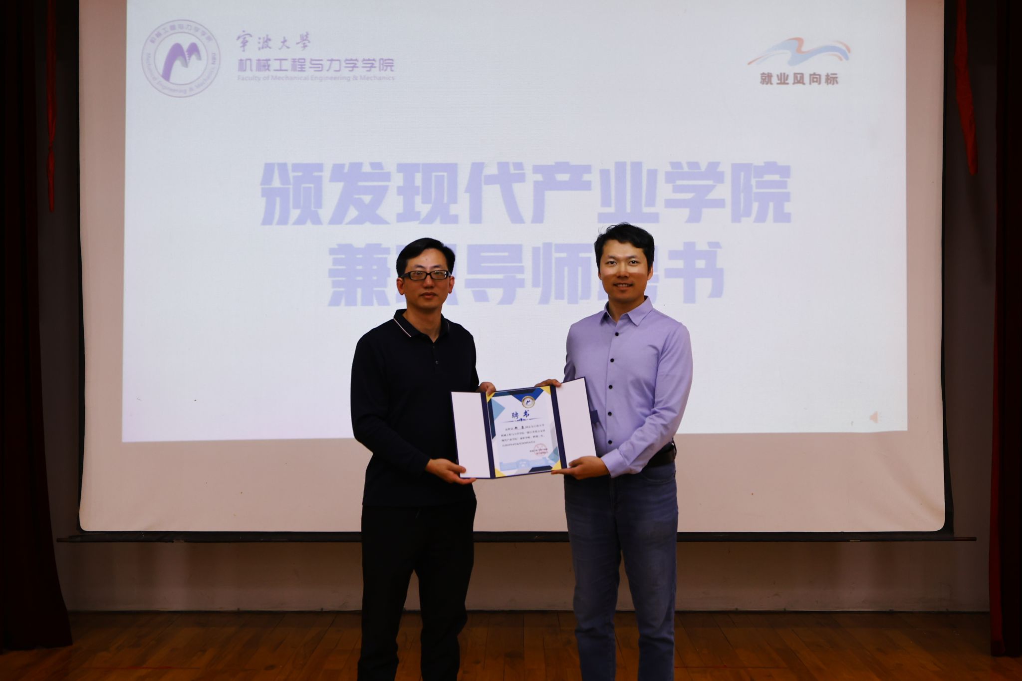 期间,还举行了汽车零部件高性能制造省级重点支持现代产业学院兼职导师聘任仪式。郑宇轩副院长为郑康院长颁发导师聘书。