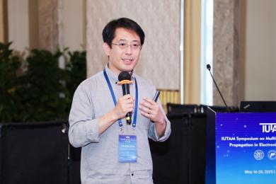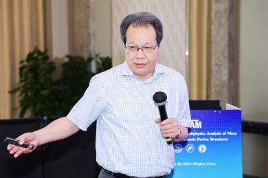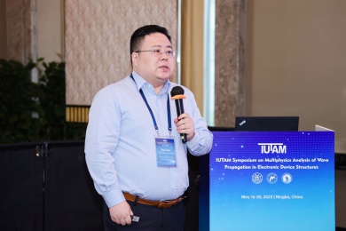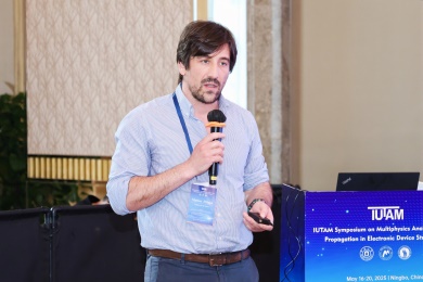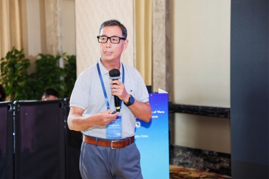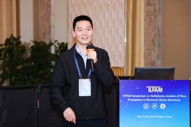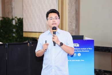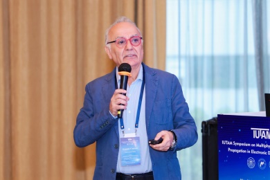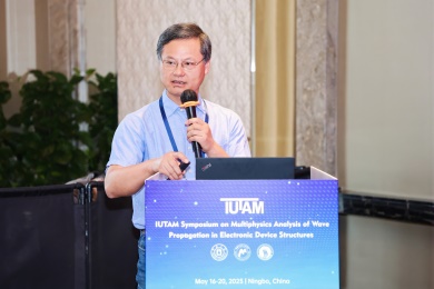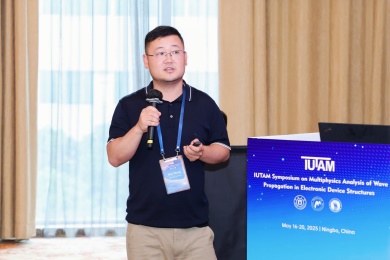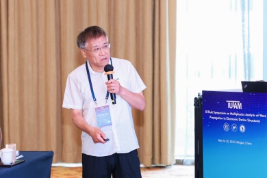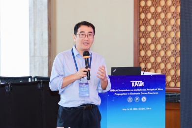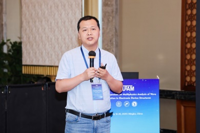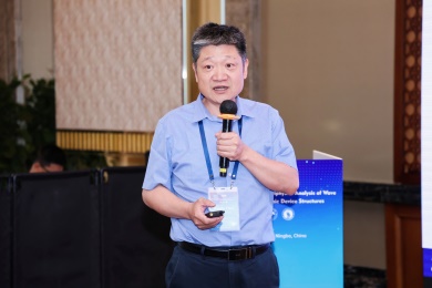 会议第一天,众多专家学者围绕电子器件结构中的波传播和振动问题,展示了前沿研究成果。清华大学的高华健院士探讨了多尺度仿生纤维水凝胶的变形与增韧机制;东南大学章公也副教授利用深度学习方法研究了压电声子晶体的能带调控;西安交通大学金峰教授分析了复合半导体与压电结构中Lamb波的传播;南京航空航天大学Hornsen Tzou(邹鸿生)教授介绍了光致形状记忆聚合物和光伏-挠电混合驱动器,实现了结构的非接触式精准振动控制;北京科技大学魏培君教授开展了热-压电半导体波动问题的辛弹性分析;TXC公司副首席技术官鲍世勇博士分享了高频高稳定石英谐振器的设计挑战;北京理工大学周萧明教授则研究了非厄米力学系统中的手性模态传输。南京航空航天大学卢天健教授提出了一种通过流固耦合调控压电悬臂振动,低维护、高效的风能采集方案;电子科技大学王曾晖教授展示了二维纳米机电共振器中的可调光机械响应;都灵理工大学的Enrico Zappino副教授提出了用于复合结构Lamb波传播的节点依赖运动学方法;洪家旺教授团队展示了固体中的新型挠电效应;北京理工大学胡更开教授介绍了声子超材料的Willis动态均质化方法;英国阿伯丁大学Marian Wiercigroch教授构建了非光滑动力学系统的低维校准模型;都灵理工大学Matteo Filippi博士使用一维CUF方法分析多层电子器件的热弹性行为;南昌大学郑辉教授展示了局部径向基函数配置方法在工程问题中的最新进展。