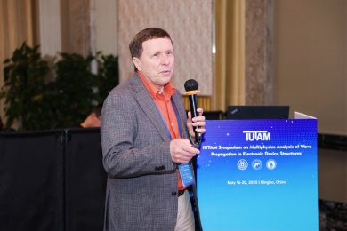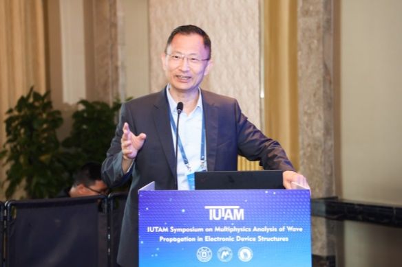 的发展、现状和优势学科。清华大学高华健院士代表IUTAM致辞,他说本次IUTAM研讨会虽历经筹备波折,好事多磨,终得圆满举行,并祝贺大会顺利召开。中国力学学会副理事长张东晓院士代表中国力学学会致辞,他向长期为力学事业奉献的国内外各界同仁表示敬意,并表示中国力学学会将一如既往支持在中国举办此类高端学术会议。大会共同主席王骥教授致辞,介绍了研讨会的申办过程,回顾了电子器件领域的发展历程与先驱贡献,感恩各方支持与协作。南京航空航天大学的卢天健教授对本次会议的召开表示热烈祝贺。