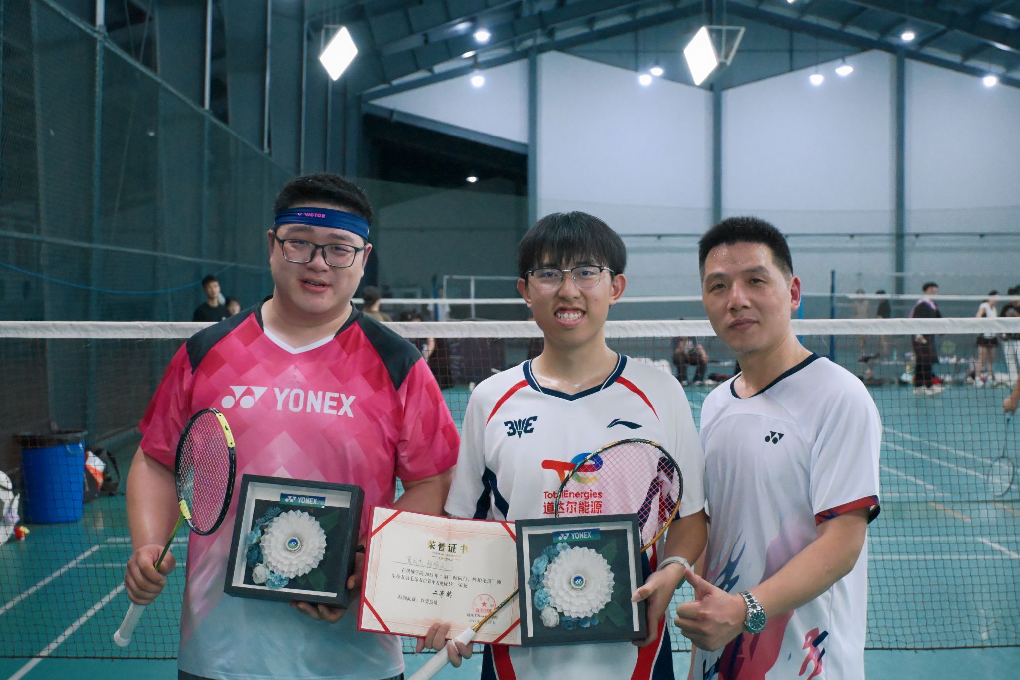 半决赛中的一场对决,堪称本场赛事的 “高光之战”。对阵双方中的第 3 组队伍,由经验丰富的教师付应乾和实力强劲的学生郑天喆组成,他们自开赛以来便凭借默契配合和高超球技一路过关斩将。此次面对同样实力不俗的对手,比赛从一开始便陷入胶着,比分一路紧咬,交替上升。当比分定格在 21:21 时,比赛进入白热化的加赛环节。他们屏气凝神,眼神中满是坚定,面对对手的猛烈进攻,他们沉着应对,每一次挥拍都倾注全力,每一次救球都拼尽全力。关键时刻,第 3 组队伍凭借更沉稳的心态和更果断的战术调整,抓住稍纵即逝的机会,连得两分,以 23:21 的比分惊险拿下比赛,成功晋级决赛。