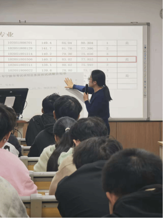 讲座中,兰浩老师带领同学们剖析了简历制作的关键要点,包括如何突出个人优势、精准匹配岗位需求等实用技巧,指导了如何使简历脱颖而出,作为宁大校友的他也提出了更适合宁大学子的职业规划。栗子老师则针对体制内考试,详细阐述了备考的策略和方法,并分享了浙江省考情的最新动态和上岸经验,通过展示公考真题以及趣味问答,让同学们在轻松活跃的氛围中了解了体制内上岸的相关内容。讲座期间,同学们积极互动,提出了许多过于简历优化和职业选择的问题,两位老师耐心解答,为同学们提供了宝贵的建议。